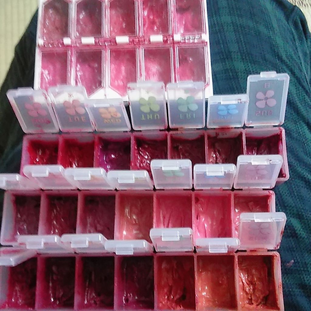 モンモンとした日は何かに没頭すると気分転換なると、言うことでこれからリップ作るよ今日はミルキーオレンジ色系リップパレット💗透け感リップに近くなるかな?どうだろーまっ違ってもそれはそれだ(笑)唇美容液入れてリップパレット作ってます😁✌ダイソーの...