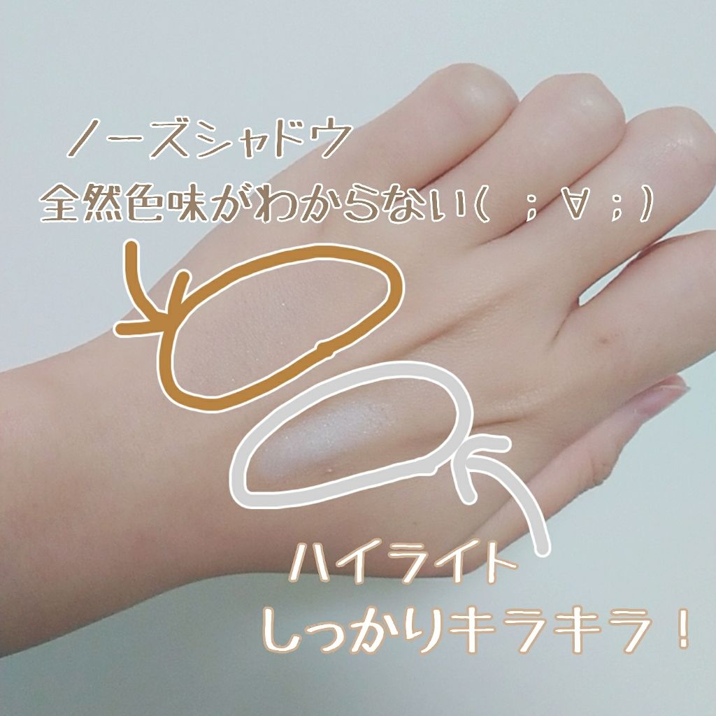 - 鼻をクッキリより高く見せる。 ハイライトとノーズシャドウが1つになっているから簡単にスッと鼻高。立体メリハリ小顔に。 サラっとしたパウダータイプ。 ハイライト効果の高い微粒子ホワイトパールと、肌にしっとりとなじみ、不自然にならないベージュがかったブラウンの組み合わせ。