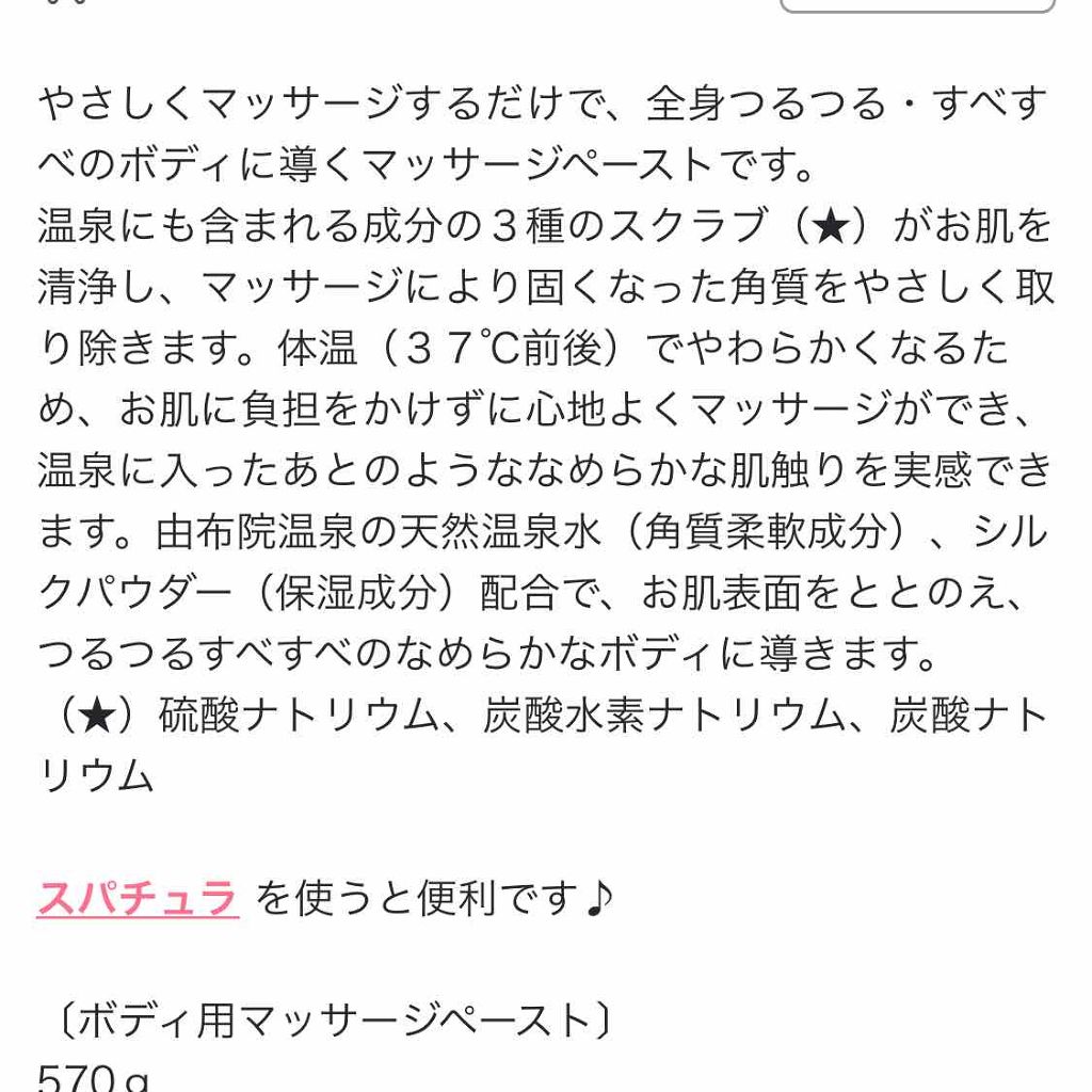 | ボディケアランキング第19位 | 温泉にも含まれている成分でできた3種のスクラブが古い角質をやさしく取り除いてくれる | 詳細を見る | |