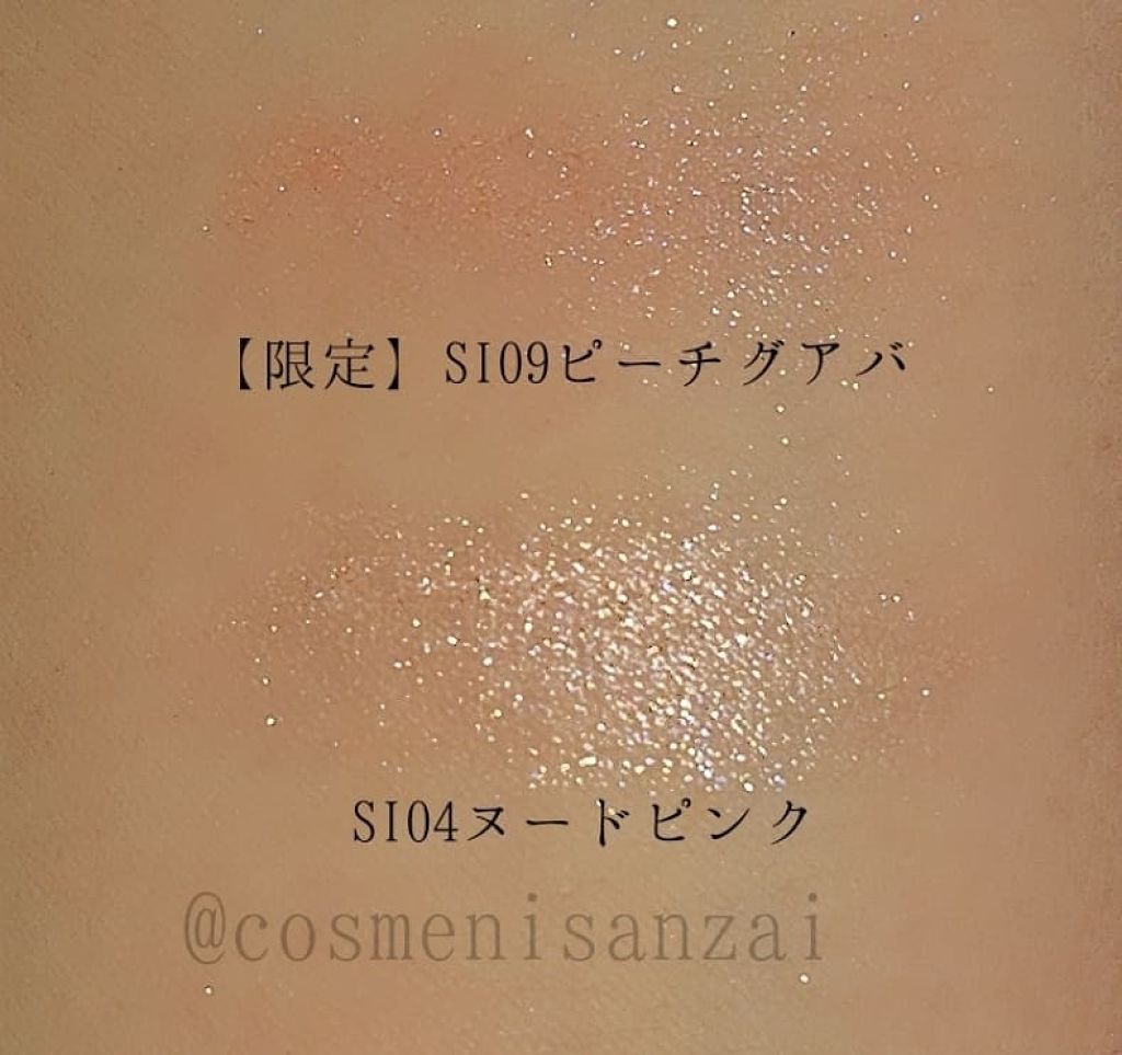 - <SI01ブロンズゴールド> ラウリン酸亜鉛、リンゴ酸ジイソステアリル、トリエチルヘキサノイン、イソステアリン酸水添ヒマシ油、ステアリン酸ソルビタン、トコフェロール、ジメチコン、メチルパラベン、(+/-)(PET/Al)ラミネート、Al、PET、グンジョウ、タルク、ホウケイ酸(Ca/Al)、ポリウレタン-11、マイカ、黄4、金、銀、酸化チタン、酸化鉄、赤104(1)、赤226 <SI02 シルバーホワイト> ラウリン酸亜鉛、リンゴ酸ジイソステアリル、トリエチルヘキサノイン、イソステアリン酸水添ヒマシ油、ステアリン酸ソルビタン、トコフェロール、ジメチコン、メチルパラベン、(+/-)(PET/Al)ラミネート、Al、PET、グンジョウ、タルク、ホウケイ酸(Ca/Al)、ポリウレタン-11、マイカ、黄4、金、銀、酸化チタン、酸化鉄、赤104(1)、赤226 <SI03イエローゴールド> ラウリン酸亜鉛、リンゴ酸ジイソステアリル、トリエチルヘキサノイン、イソステアリン酸水添ヒマシ油、ステアリン酸ソルビタン、トコフェロール、ジメチコン、メチルパラベン、(+/-)(PET/Al)ラミネート、Al、PET、グンジョウ、タルク、ホウケイ酸(Ca/Al)、ポリウレタン-11、マイカ、黄4、金、銀、酸化チタン、酸化鉄、赤104(1)、赤226 <SI04ヌードピンク> ラウリン酸亜鉛、リンゴ酸ジイソステアリル、トリエチルヘキサノイン、イソステアリン酸水添ヒマシ油、ステアリン酸ソルビタン、トコフェロール、ジメチコン、メチルパラベン、(+/-)(PET/Al)ラミネート、Al、PET、グンジョウ、タルク、ホウケイ酸(Ca/Al)、ポリウレタン-11、マイカ、黄4、金、銀、酸化チタン、酸化鉄、赤104(1)、赤226 <SI06 アイスグレー> ラウリン酸亜鉛、リンゴ酸ジイソステアリル、トリエチルヘキサノイン、イソステアリン酸水添ヒマシ油、ステアリン酸ソルビタン、トコフェロール、ジメチコン、メチルパラベン、コンジョウ、タルク、ホウケイ酸(Ca/Al)、マイカ、金、銀、酸化チタン、酸化鉄 <SI08 ピンクライラック> ラウリン酸亜鉛、トリエチルヘキサノイン、リンゴ酸ジイソステアリル、イソステアリン酸水添ヒマシ油、ステアリン酸ソルビタン、ジメチコン、トコフェロール、メチルパラベン、グンジョウ、コンジョウ、タルク、ホウケイ酸(Ca/Al)、マイカ、金、銀、酸化チタン、酸化鉄、赤226 <SI09 ピーチグアバ> ラウリン酸亜鉛、トリエチルヘキサノイン、リンゴ酸ジイソステアリル、イソステアリン酸水添ヒマシ油、ステアリン酸ソルビタン、ジメチコン、トコフェロール、メチルパラベン、タルク、ホウケイ酸(Ca/Al)、マイカ、金、銀、酸化チタン、酸化鉄、赤226