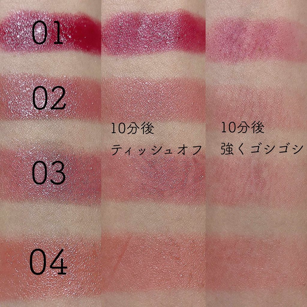 - ふわっととろけて ぽわんと発色 ティント処方の落ちないルージュ Chapter.1 血色感をあやつるリップ下地効果で、くすみを補正し肌まで明るく見える色づきに。 Chapter.2 光を集めるレフ板効果で、ナチュラルな立体感をあたえ、唇のまるさを強調。 Chapter.3 うるおいリップケア成分たっぷり配合で、乾かさない。