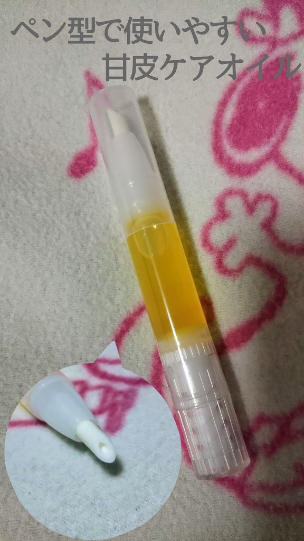 持ち歩き用で使っています。ペンのような形で先は刷毛になっています。 スキマ時間にササッと塗れて、オイルがサラサラではないので垂れたりすることもありません。 黄色の方は甘皮ケアオイルで、こちらはお家で使っています。