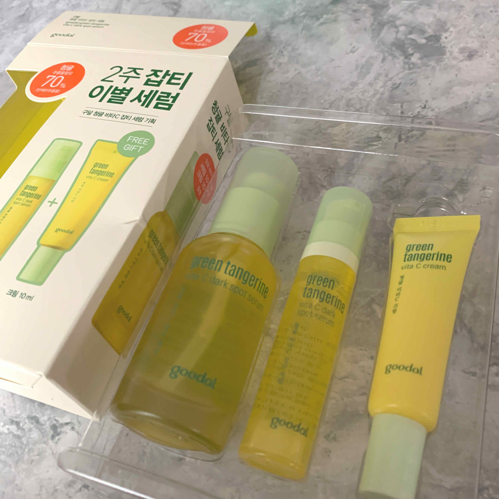 ※2023年使用品※旧品美容液、クリーム、シートマスク・商品名goodal(グーダル) グリーンタンジェリンビタCダークスポットケアセラム Vクリーム グリーンタンジェリンビタCセラムマスク・値段わからない(1753円で購入)・購入場所ドンキ...