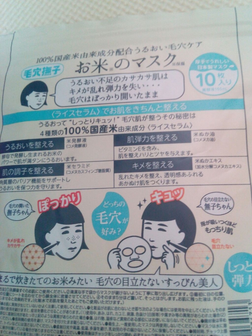 - 乾燥毛穴にお米のマスク!100%国産米由来成分ライスセラム(コメ発酵液、コメヌカ油、コメヌカスフィンゴ糖脂質、加水分解コメヌカエキス:保湿成分)配合。うるおって、しっとりキュッと毛穴肌を整えます。まるで炊きたてのお米みたい、毛穴の目立たないすっぴん美人に!厚手でうれしい日本製マスク。