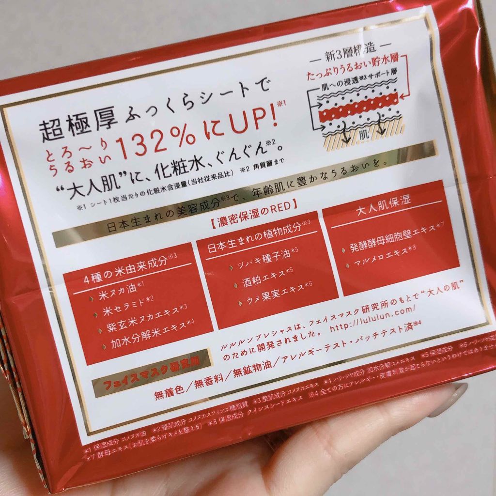 - <ルルルンプレシャス RED(モイスト)32枚入【旧】> 水、グリセリン、BG、PEG/PPG/ポリブチレングリコール-8/5/3グリセリン、ツバキ種子油、トリ脂肪酸(C18-36)グリセリル、トリ脂肪酸(C12-18)グリセリル、ホホバエステル、スクワレン、マカデミアナッツ脂肪酸フィトステリル、フィトステロールズ、トコフェロール、クインスシードエキス、サッカロミセス/コメ発酵液、イノシトール、オリザノール、スイゼンジノリ多糖体、ハチミツエキス、水添レシチン、プロパンジオール、イソステアリン酸ポリグリセリル-10、キサンタンガム、クエン酸、クエン酸Na、フェノキシエタノール、メチルパラベン <ルルルンプレシャス RED(モイスト)7枚入【旧】> 水、グリセリン、BG、PEG/PPG/ポリブチレングリコール-8/5/3グリセリン、ツバキ種子油、トリ脂肪酸(C18-36)グリセリル、トリ脂肪酸(C12-18)グリセリル、ホホバエステル、スクワレン、マカデミアナッツ脂肪酸フィトステリル、フィトステロールズ、トコフェロール、クインスシードエキス、サッカロミセス/コメ発酵液、イノシトール、オリザノール、スイゼンジノリ多糖体、ハチミツエキス、水添レシチン、プロパンジオール、イソステアリン酸ポリグリセリル-10、キサンタンガム、クエン酸、クエン酸Na、フェノキシエタノール、メチルパラベン