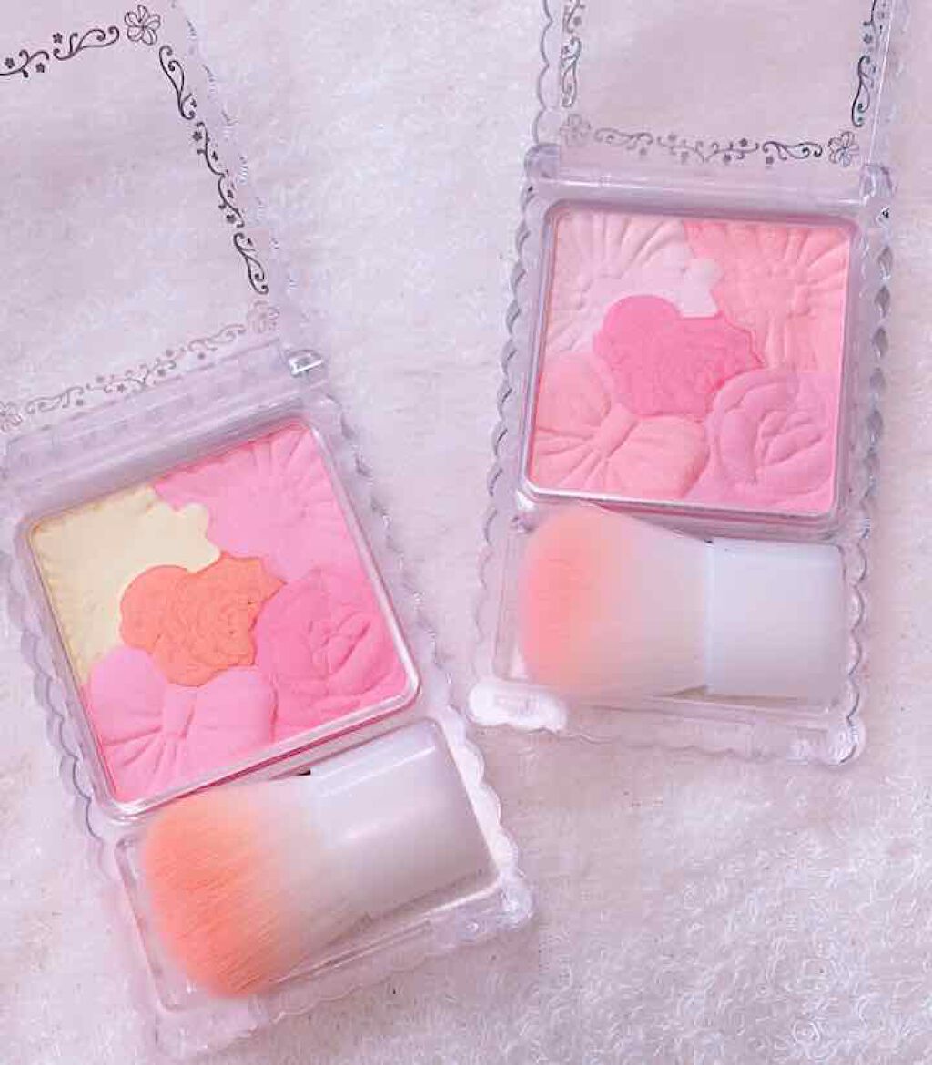 見た目がハート型で可愛いのに 粉質はしっとり付属のブラシもチクチクせず塗布できて660円はすごい🌸 透け感のあるツヤ仕上がりで P04はハイライトとして使うのも◎ 全部色味の違うピンクカラーでその日の気分やメイクに合わせて使い分けてる🌷