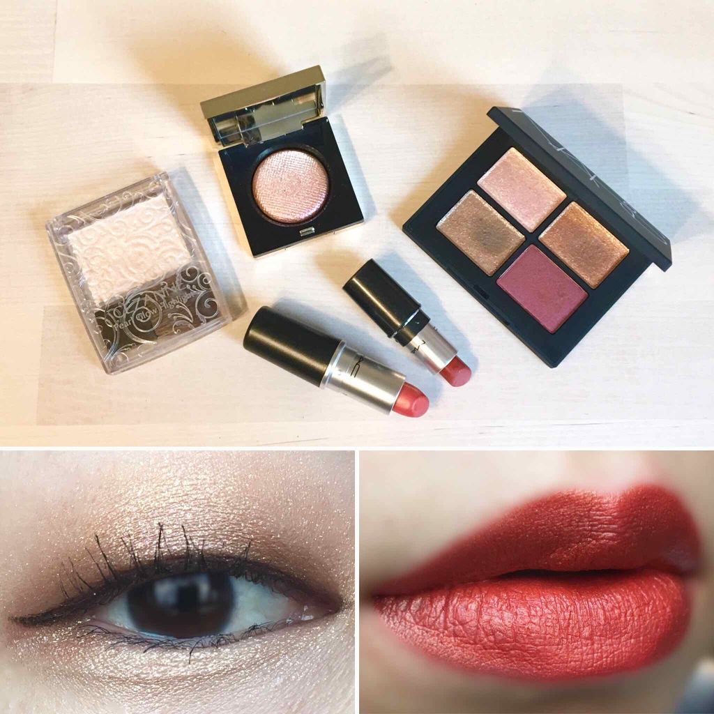 KANEBOのレイヤードカラーズアイシャドウ良い。 下瞼に使ったオレンジをメインにすれば夏メイクだし、上瞼の赤茶やブラウンをメインにすれば秋めいた深みが出る🍂 チークはキャンメイクのテラコッタ、リップはMACのチリで色鮮やかに。
