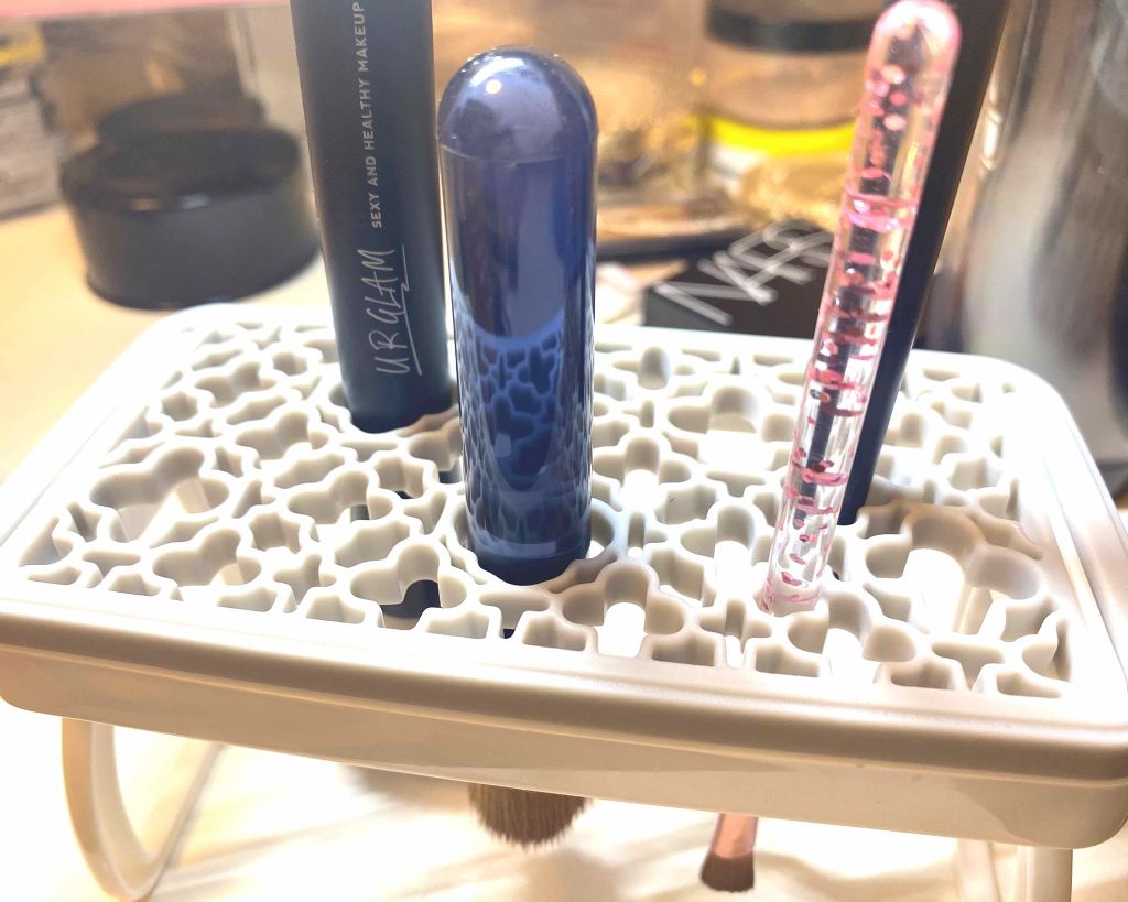 メイクブラシをきれいに乾かせる! メイクブラシの乾燥に最適なスタンド!!毛先を下向きにして乾かすことができるから毛が傷みにくいし、ブラシの形も保たれる! 色んな大きさの穴があって色んな太さのブラシを挟めるよ〜!! 折りたためるから使わない時も場所を取らないのもすき!🤍