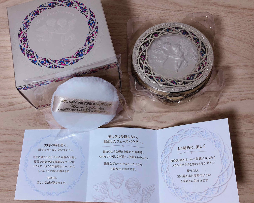 - 二人の守護天使のデザインを容器とパウダー表面にあしらい、大聖堂のステンドグラスのような清らかな輝きに包まれた特別なデザイン。 お互いを守り、喜びを分かち合うことで優しさに満ちあふれた日々が訪れるように。 美のお守りのように、慈愛にあふれた幸せを表現したミラノコレクションです。 ◆ ベースメイクの美しさを引き立てるプレミアムな粉 ・しっとり心地よい感触で肌を包み込み、ベールをまとったような、キメ細かくなめらかに整った上質肌に仕上げます。 ・繊細な純白質感のパウダーが、ファンデーションの透明感や明るさを引き立てます。 ・ファンデーションをやさしくフィットさせ、つけたての美しさを持続します。 ・ヒアルロン酸、ローヤルゼリーエキス配合(保湿)。 ◆ ミラノコレクションを象徴する美しさを運ぶ香り ・美しくなれるような、稀少なローズの*天然精油を配合した新「プレミアムローズ」の香り。*香料の一部に配合 ◆ こだわりのオリジナルパフ ・ベルベット生地を使用し、繊細でなめらかな使い心地。 ・生地の糸が均等に配列され、パウダーをまんべんなく含むため、粉含みがよくキメの細かい均ーな仕上がりに。 ・ミラノコレクションのために設計された、オリジナルのパフです。