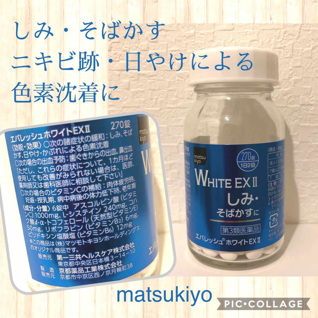 シミ、そばかす、色素沈着に🚑🌱□商品情報□ブランド名:マツモトキヨシラボ商品名:エバレッシュホワイトEXII販売価格:180錠税込¥2,074-/270錠税込¥2,933-このサプリは、"L-システイン"と"ビタミンC"で色素沈着やシミ、そば...