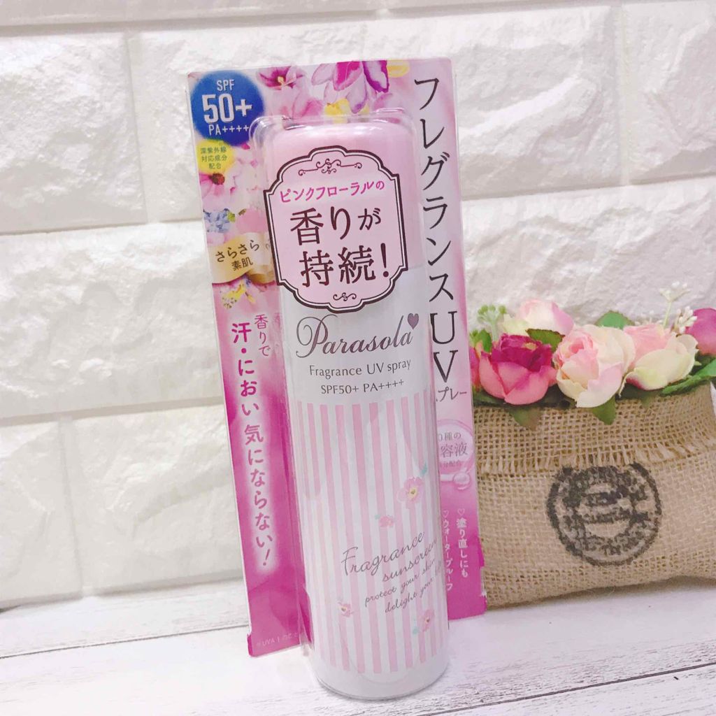 - SPF50+・PA++++ ピンクフローラルの香り持続効果、ウォータープルーフ効果がパワーアップ。スキンケア感覚で白浮きゼロのフレグランスUVスプレー。逆さでも使えるから塗りにくい部分も簡単UVブロック、髪・顔にもOK。香りで汗・ニオイも気にならない。10種の美容液成分配合。また石けんで落とせ、日常での使いやすさも特徴。無着色、無鉱物オイル、無タール系色素。深紫外線対応成分配合。からだ、顔、髪用。