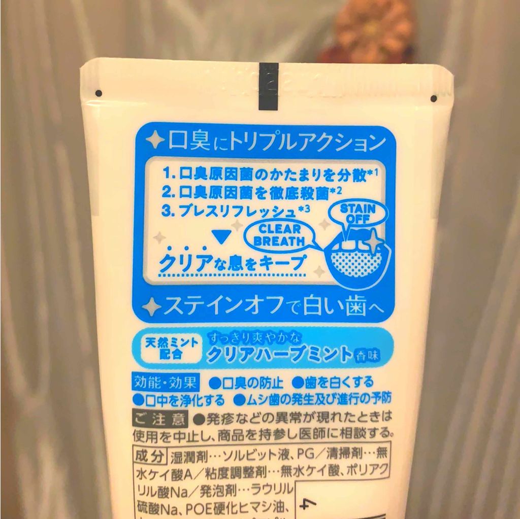 - クリアハーブミント 湿潤剤:ソルビット液、PG 清掃剤:無水ケイ酸A 粘度調整剤:無水ケイ酸、ポリアクリル酸Na 発泡剤:ラウリル硫酸Na、POE硬化ヒマシ油、ヤシ油脂肪酸アミドプロピルベタイン液 粘結剤:キサンタンガム 洗浄剤:ポリリン酸Na、炭酸水素Na 香味剤:香料(クリアハーブミントタイプ)、サッカリンNa 安定剤:酸化Ti 清涼剤:メントール 薬用成分:フッ化ナトリウム(フッ素)、ラウロイルサルコシンNa(LSS) pH調整剤:水酸化ナトリウム液 保存剤:パラベン 矯味剤:ローズマリーエキス ピュアリーミント 湿潤剤:ソルビット液、PG 清掃剤:無水ケイ酸A 粘度調整剤:無水ケイ酸、ポリアクリル酸Na 発泡剤:ラウリル硫酸Na、POE硬化ヒマシ油、ヤシ油脂肪酸アミドプロピルベタイン液 粘結剤:キサンタンガム 洗浄剤:ポリリン酸Na、炭酸水素Na 香味剤:香料(ピュアリーミントタイプ)、サッカリンNa 安定剤:酸化Ti 清涼剤:メントール 薬用成分:フッ化ナトリウム(フッ素)、ラウロイルサルコシンNa(LSS) pH調整剤:水酸化ナトリウム液 保存剤:パラベン 矯味剤:ローズマリーエキス スプラッシュシトラスミント 湿潤剤:ソルビット液、PG 清掃剤:無水ケイ酸A 粘度調整剤:無水ケイ酸、ポリアクリル酸Na 発泡剤:ラウリル硫酸Na、POE硬化ヒマシ油、ヤシ油脂肪酸アミドプロピルベタイン液 粘結剤:キサンタンガム 洗浄剤:ポリリン酸Na、炭酸水素Na 香味剤:香料(スプラッシュシトラスミントタイプ)、サッカリンNa 安定剤:酸化Ti 清涼剤:メントール 薬用成分:フッ化ナトリウム(フッ素)、ラウロイルサルコシンNa(LSS) pH調整剤:水酸化ナトリウム液 保存剤:パラベン 矯味剤:ローズマリーエキス