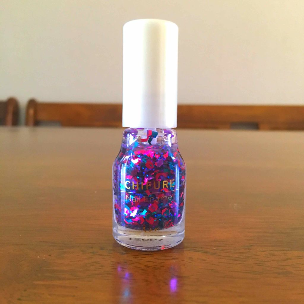 ちふれネイル エナメル 017カラフルラメ、348パープル系ラメ、545レッド系 塗ってるだけです😆 348パープル系ラメを2度塗り 🌬️5分ほど乾かす 💅545レッド系を半分に塗る 金箔みたいなラメが入ってるので塗った時に上手くつかなかったらパレット等に出して爪楊枝でつけるのもおすすめ