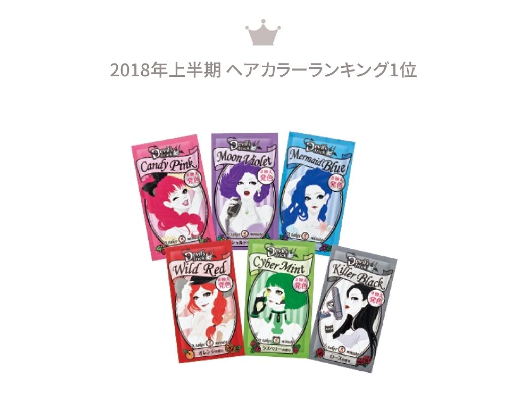 - 傷んだ髪ほどよく染まるヘアカラートリートメントで、“常色"はずれの映え発色! 素手で簡単5分、イオンカラーでツヤさら髪色チェンジ! 約1週間でもとの髪色に戻るから、流行カラーも気軽に試せます。 カラー剤とは思えないフルーツなどの香りで、カラーリング中も楽しめます♪ ※仕上がりの色は元の髪色・傷み具合・髪質によって個人差があります。 ※健康毛や暗い髪・白髪には発色しないことがあります。 <Devil’s 魔法の秘密> ①5分で髪色チェンジ!簡単+イオンカラー® イオン化した+の色素を傷んだ髪に多い-のイオンとくっつけるから発色キレイ♪ 素手でOK! シャンプーすれば1weekで魔法がとけて元通り! ②傷みを集中ケア★ツヤさら髪に変身 保湿成分「ホホバ種子油」「ツバキ種子油」配合で髪にたっぷり潤い満タン。驚きのツヤ髪に! ※頭皮につけないようにご注意ください。 ※素手で塗布したあとはすぐに石けんで手を洗ってください。