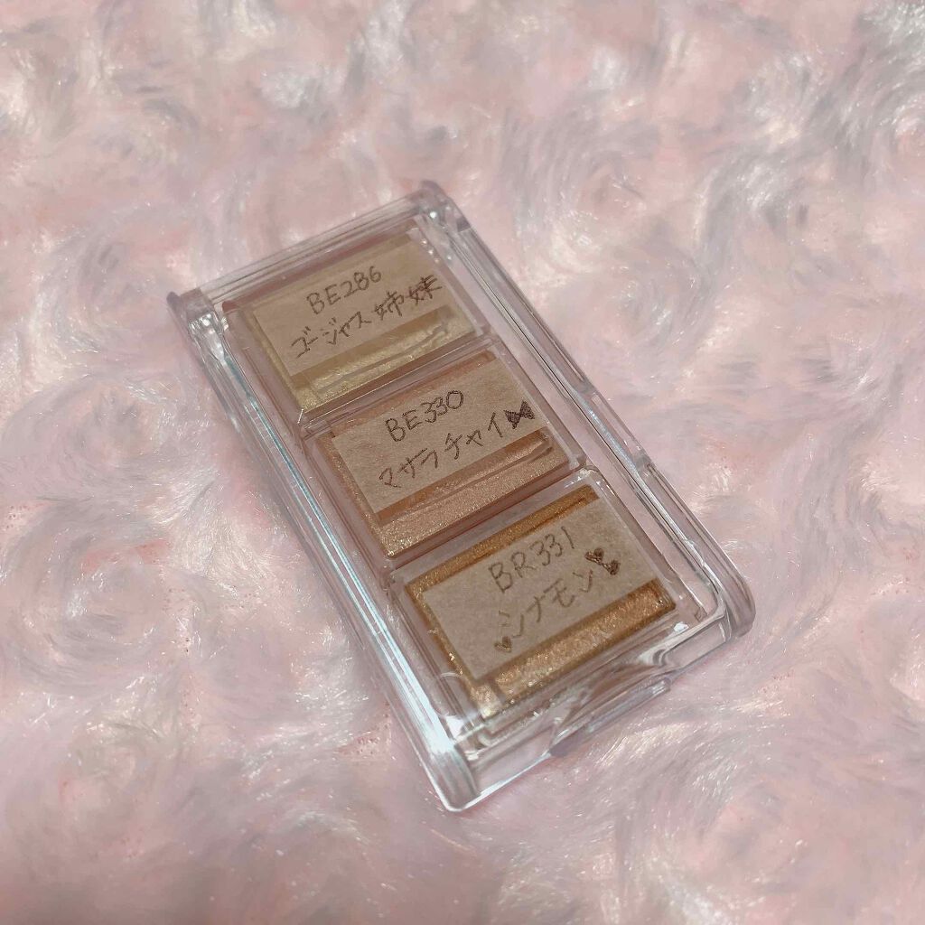 mude.の方がよりあたたかみのある印象で全体的に使いやすい色味が入っている感じ◎ ラメ感もギラギラするよりかは上品なキラキラ感✨ rom&ndはmude.に比べるとフレッシュな印象!春や夏に使うと映えそう❣️ ラメ感も強く、目立つかな。 似てるかもしれないからと買うのを長い間悩んでいましたが、仕上がりが全然変わってくるので、買って良かった😂❤️ 粉質はブランドも違うので違ったよ✨ rom&ndの方がしっとり感があって強く発色する感じ。 mude.は淡い発色で、初心者さんも使いやすいと思った🫶🏻