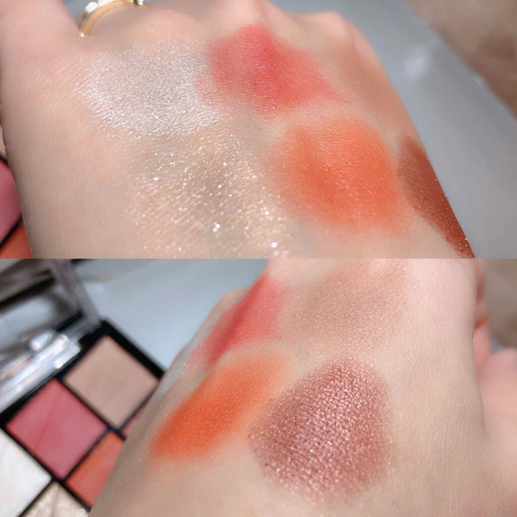 よくパレットのなかで明るいカラーをベースにまぶたに広く塗ることが多いのですが、パール感のあるカラーを避ける🙆♀️! パール感たっぷりの明るいカラーは涙袋に使うぐらい光を集めてぷっくり見せてくれるので、まぶたに広く使うと腫れぼったく見えがち😓 目元を明るくみせてくれたり、次に使うアイシャドウをぼかしやすくしてくれるけど、すっ飛ばしてメインのカラーを塗っちゃう✊🏻❤️🔥 涙袋にはたっぷり塗ってぷっくり見せる🙆♀️💕 シルキースフレアイズのマットタイプはすごく優れているな〜と感じました☺️💗 赤やオレンジなどは、入れすぎると腫れぼったく見えやすいので、見せたいカラーは下まぶた目尻にのせて色をたのしむ♡♡ パール感なしの透けマットだけじゃ物足りない… そう感じさせない華やかなラメが左上に入っているので黒目上と涙袋にのせるとすごく可愛い仕上がりに😍! 厄介な左右差のお陰でマットアイシャドウが好きになりました😌💕