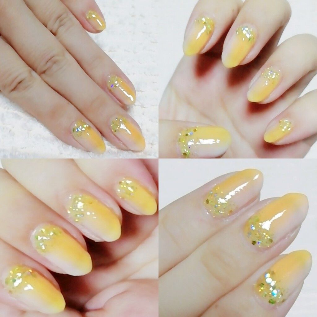 オレンジの誘惑に負けた🧡😍可愛すぎる!!ちふれのオレンジラメ🧡ちふれネイルエナメル017カラフルラメ可愛い、、マジで可愛すぎて夢中で塗ってたら、グラデーションしか出来なかった(笑)オレンジの微細なラメに、大きめゴールドのホロ⭐️塗るとシアーな...
