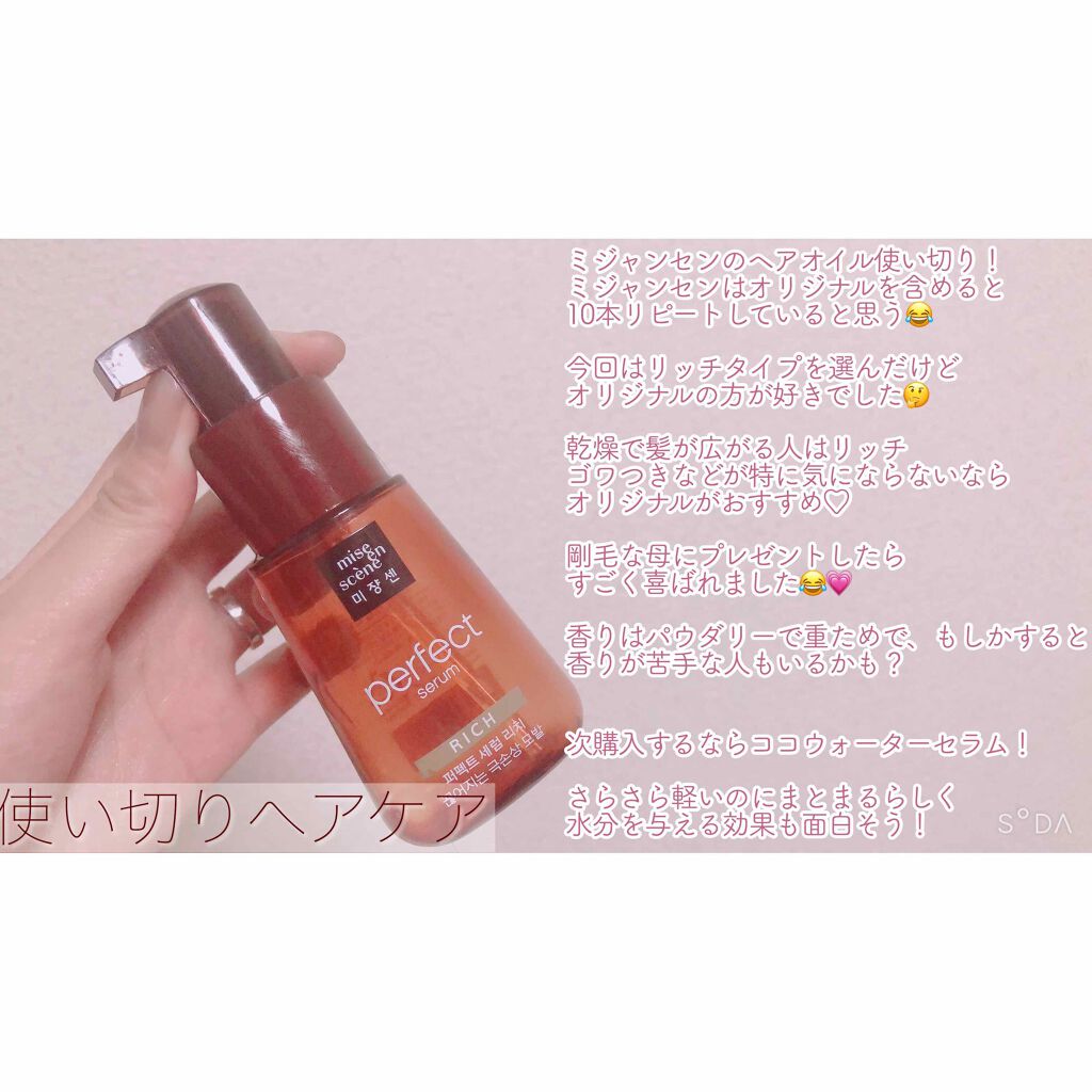 #使い切りコスメmiseensceneミジャンセンパーフェクトセラムオリジナルセラム韓国で有名なヘアオイル日本でも最近店頭で普通に売ってる数種類あるけどこのオレンジのが1番ベーシックなかんじすこしロレアルのヘアオイルぽさある種類の展開含めてw...