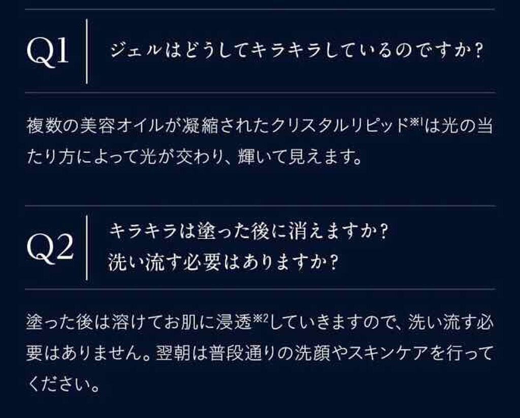 - 塗って寝るだけ、朝ぷるんっ!おやすみ前の新習慣! 新世代スキンケアブランド・ALFACE+(オルフェス)から スリーピングパックが新登場_ キラキラ輝くジェルがおやすみの間のお肌を守ります。 ★オルフェス スターリーナイトジェルマスク★ 30g 2,500円+tax _How To Use 適量を手に取り、お肌にやさしくなじませてください。 使い方はあなた次第! ★1 フェイスマスクのあとに、仕上げのクリームとして。 ★2 普段のスキンケアの最後に、うるおいヴェールとして。 ★3 お手入れのあいだに、美容液として気になる部分にも。 _Features ☆キラキラ輝く「クリスタルリピッド」 光の反射によりキラキラ輝くクリスタルリピッド(複合美容オイル成分)が、 おやすみの間にうるおいをチャージ。 ☆5つの発酵エキス 天然の保湿力で肌にうるおいとハリツヤを与え、ざらつきやくすみをケア。 肌本来の美しさを引き出します。 ☆集中ナイトケア成分 お疲れ肌を整えて、朝の素肌をすこやかに。 お肌を外部刺激から守り、保水力をキープ。 ☆癒しのスキンケアタイムをもたらす香り クレオパトラも愛用していたといわれる穏やかなフランキンセンスに、 明るく爽やかなベルガモットとグレープフルーツの香り。