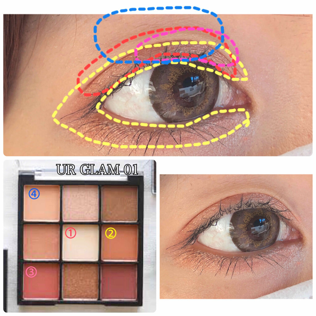 URGLAM01ブラウン系◎丸目が作りやすい今日はワンポイントキャラTを着てたので目は丸くなるようにアイライン無しのマスカラは上下真ん中を重点的に♡#ダイソー#アイシャドウ#とても使いやすい...