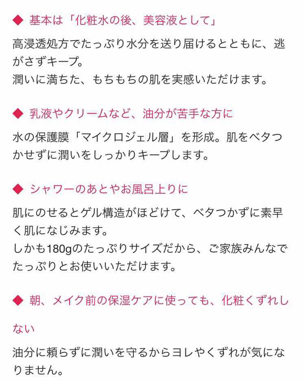 - 肌にうるおいを与えてスキンコンディションを整える、 天然保湿成分ハトムギエキス配合の保湿ジェルです。 ジェルを肌にのせると液状に変化して、肌表面に「水の保護膜」を形成。 継続的に角質層に水分を送りこむので、うるおいに満ちた肌が続きます。 油分を抑えたみずみずしい使用感でべたつきが気になりません。 基本は化粧水の後にたっぷり使ってください。 メイク前の保湿やお風呂上がりの「とりあえず保湿」、ボディにも。 ●使用方法 ■基本は、化粧水の後に美容液として 化粧水の後にたっぷり使ってください。 500円玉大の量を2回重ねづけするのが目安です。 その後、お好みで乳液やクリームを重ねてください。 ■乳液やクリームのべたつきが気になるときに 水の保護膜でうるおいをキープし、べたつきません。 ■メイク前の保湿ケアに 油分の多いスキンケア品を使うとメイクがくずれやすいときは、 メイク前の保湿ケアとしてもお使いいただけます。 油分に頼らず肌のうるおいを守り、ヨレやくずれを防ぎます。 ■お風呂上がりの「とりあえず保湿」に ゆっくりスキンケアができないときは、 素肌に直接なじませて乾燥から肌を守ります。 油分が少ないので、後から行うスキンケアの浸透(※)を妨げません。 ※角質層まで ■ジェルパックでさらにうるおい 特に乾燥が気になるときは、 500円玉大3枚程度の量を顔全体にのせて 約5分間経ってから、肌になじませてください。 ■おやすみ前の「重ねづけ保湿」に 500円玉大の量のジェルをもう一度なじませることで、 睡眠中の乾燥を防ぎます。 ■ボディにも べたつかないので、毎日の入浴後や日差しを浴びた後などの ボディのスキンケアにもおすすめです。
