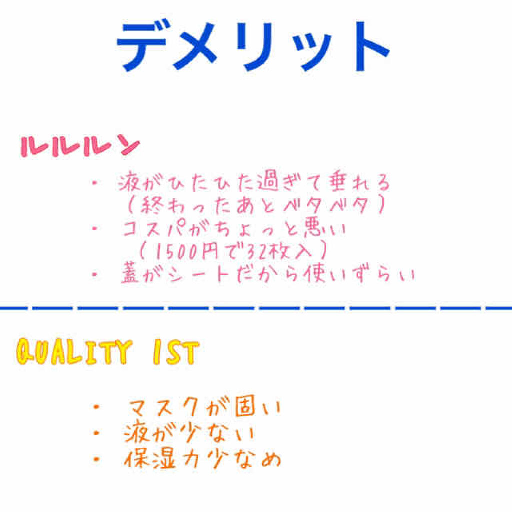 こんにちは!私は最近パックで迷走していて、LIPSで人気のこの2つを使って見た感想を独断と偏見で紹介したいと思います!私の肌⇒乾燥肌なのに鼻、おでこは少しオイリーの混合肌❤❤❤まずは2つののメリットです!〇ルルルン(1500円32枚入・液がひ...