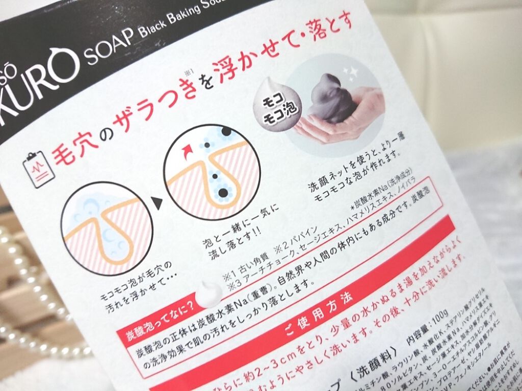 .JUSOKUROSOAP[重曹炭酸洗顔]💓重曹、パパイン酵素、炭のトリプル洗浄成分でしっかり汚れを落としてくれます✨黒いクリームを泡立てネットに入れると黒い濃密泡が簡単につくれます🐥♥️その、濃密炭酸泡が毛穴に...