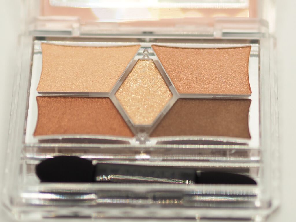 左上のラメは、ゴールドにちょっとピンクがかった?色で派手さこそ無いものの、しっとりとした粉質で瞼に優しく光をくれます。 右上の明るいブラウンは、中間色として使えそうです。ココアのような色でもあるのですが、イエベでも使えます。 左下の濃いブラウンは、締め色として使えます。アイライナー代わりに入れても良さそう。 右下のオレンジは、パッと華やぐ色です。透け感のあるオレンジなので、オレンジメイクが苦手!という方でも使いやすいカラーです。 全体的に温かみのあるカラーで、秋らしいカラーかなと思います。また、透け感が強いので、いかにもマット!というアイシャドウが苦手な方でも使いやすいパレットかと。