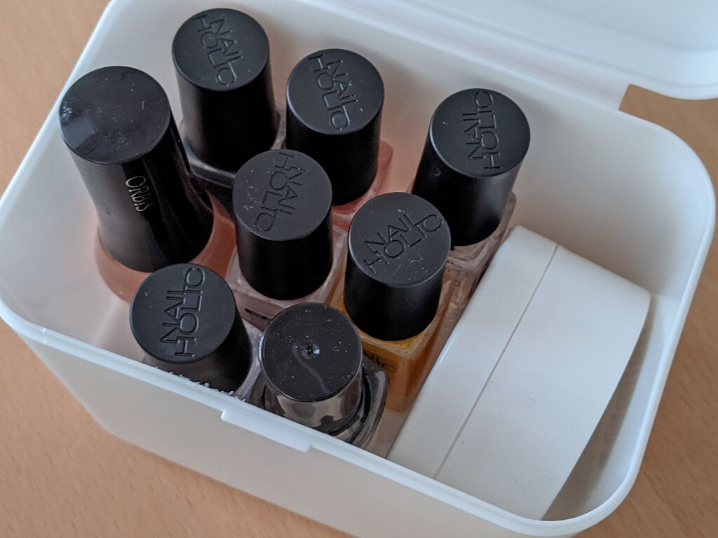 メイク収納コスメは無印で買ったケースに入れていますネイルはセリアの蓋付きケース...