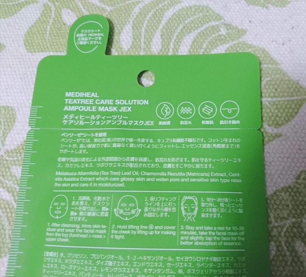メディヒールの言わずと知れた名品。鎮静効果のあるティーツリーのフェイスマスク! 肌荒れしているときや、日焼けした後におすすめです。 使用感はさっぱりで、これだけでは保湿力が物足りないためクリームなどで蓋をすると良いと思います!