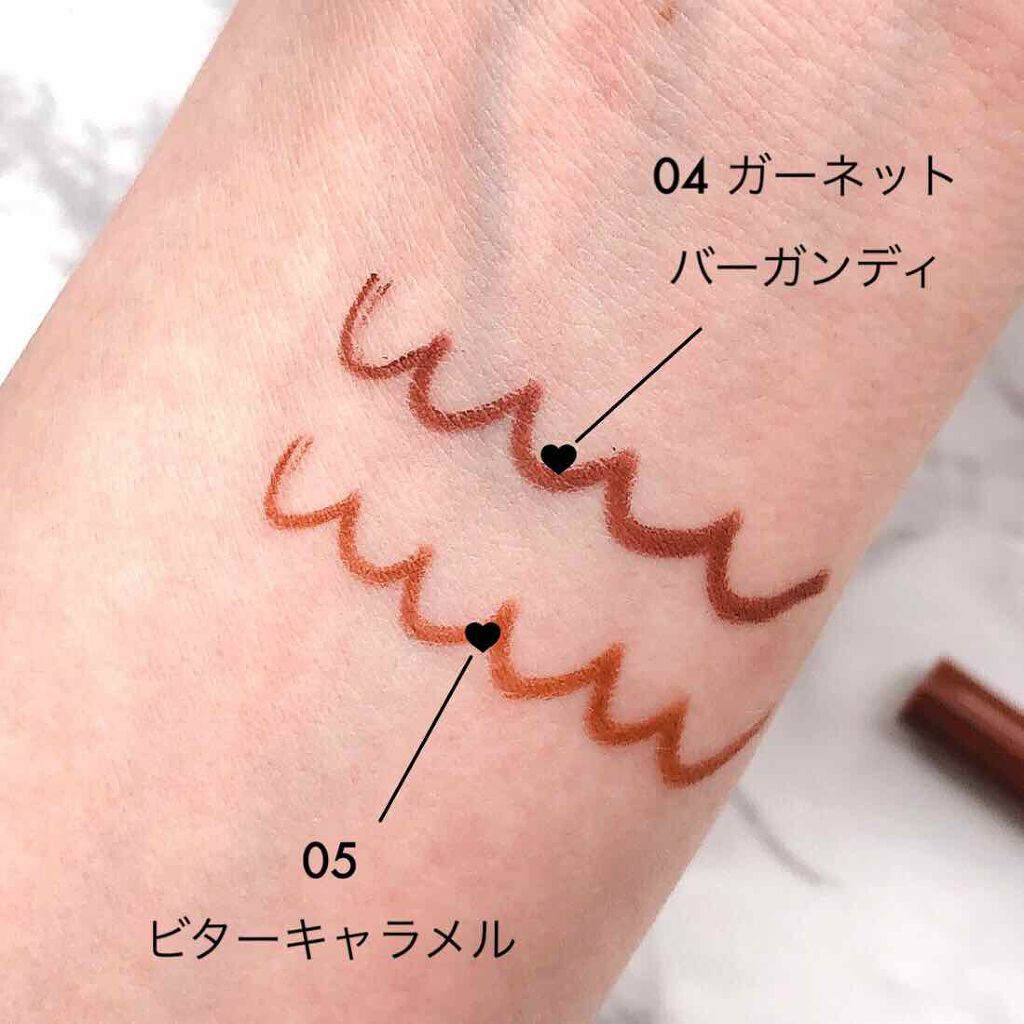 - <01 ディープブラック> メチルトリメチコン、トリメチルシロキシケイ酸、(アクリレーツ/アクリル酸ステアリル/メタクリル酸ジメチコン)コポリマー、ポリエチレン、カルナウバロウ、キャンデリラロウ、ジメチコン、水添レシチン、シリカ、メタクリル酸メチルクロスポリマー、トコフェロール、スクワラン、ホホバ種子油、マカデミア種子油、ヒアルロン酸Na、メチコン、(+/-)水酸化Al、酸化鉄、マイカ、酸化チタン <02 ミディアムブラウン> メチルトリメチコン、トリメチルシロキシケイ酸、(アクリレーツ/アクリル酸ステアリル/メタクリル酸ジメチコン)コポリマー、ポリエチレン、カルナウバロウ、キャンデリラロウ、ジメチコン、水添レシチン、シリカ、メタクリル酸メチルクロスポリマー、トコフェロール、スクワラン、ホホバ種子油、マカデミア種子油、ヒアルロン酸Na、メチコン、(+/-)水酸化Al、酸化鉄、マイカ、酸化チタン <03 ダークブラウン> メチルトリメチコン、トリメチルシロキシケイ酸、(アクリレーツ/アクリル酸ステアリル/メタクリル酸ジメチコン)コポリマー、ポリエチレン、カルナウバロウ、スクワラン、ジメチコン、水添レシチン、シリカ、トコフェロール、メタクリル酸メチルクロスポリマー、キャンデリラロウ、ホホバ種子油、マカデミア種子油、ヒアルロン酸Na、メチコン、水酸化Al、酸化鉄、酸化チタン、マイカ <04 ガーネットバーガンディ> メチルトリメチコン、トリメチルシロキシケイ酸、(アクリレーツ/アクリル酸ステアリル/メタクリル酸ジメチコン)コポリマー、ポリエチレン、カルナウバロウ、ジメチコン、キャンデリラロウ、水添レシチン、シリカ、トコフェロール、メタクリル酸メチルクロスポリマー、スクワラン、ホホバ種子油、マカデミア種子油、ヒアルロン酸Na、メチコン、水酸化Al、酸化鉄、グンジョウ、酸化チタン、マイカ <06 フォギープラム> メチルトリメチコン、トリメチルシロキシケイ酸、(アクリレーツ/アクリル酸ステアリル/メタクリル酸ジメチコン)コポリマー、ポリエチレン、カルナウバロウ、ジメチコン、キャンデリラロウ、水酸化Al、水添レシチン、シリカ、トコフェロール、メタクリル酸メチルクロスポリマー、スクワラン、ホホバ種子油、マカデミア種子油、ヒアルロン酸Na、メチコン、酸化鉄、グンジョウ、酸化チタン、マイカ <07 アズキブラウン> メチルトリメチコン、トリメチルシロキシケイ酸、(アクリレーツ/アクリル酸ステアリル/メタクリル酸ジメチコン)コポリマー、ポリエチレン、カルナウバロウ、キャンデリラロウ、ジメチコン、水添レシチン、シリカ、トコフェロール、メタクリル酸メチルクロスポリマー、スクワラン、ホホバ種子油、マカデミア種子油、水酸化Al、ハイドロゲンジメチコン、ヒアルロン酸Na、メチコン、酸化鉄、グンジョウ、マイカ、酸化チタン <09 ダージリンピンク> メチルトリメチコン、トリメチルシロキシケイ酸、(アクリレーツ/アクリル酸ステアリル/メタクリル酸ジメチコン)コポリマー、合成ワックス、カルナウバロウ、キャンデリラロウ、ジメチコン、水酸化Al、ハイドロゲンジメチコン、水添レシチン、シリカ、トコフェロール、メタクリル酸メチルクロスポリマー、スクワラン、ホホバ種子油、マカデミア種子油、ヒアルロン酸Na、メチコン、酸化鉄、酸化チタン、マイカ、グンジョウ <11 クラウディーグレー> メチルトリメチコン、トリメチルシロキシケイ酸、(アクリレーツ/アクリル酸ステアリル/メタクリル酸ジメチコン)コポリマー、合成ワックス、カルナウバロウ、ジメチコン、キャンデリラロウ、水酸化Al、水添レシチン、シリカ、トコフェロール、メタクリル酸メチルクロスポリマー、ハイドロゲンジメチコン、スクワラン、ホホバ種子油、マカデミア種子油、ヒアルロン酸Na、メチコン、酸化鉄、酸化チタン、マイカ <15 カプチーノピンク> メチルトリメチコン、トリメチルシロキシケイ酸、(アクリレーツ/アクリル酸ステアリル/メタクリル酸ジメチコン)コポリマー、合成ワックス、カルナウバロウ、ジメチコン、キャンデリラロウ、水酸化Al、水添レシチン、シリカ、トコフェロール、メタクリル酸メチルクロスポリマー、スクワラン、ホホバ種子油、マカデミア種子油、ヒアルロン酸Na、メチコン、酸化チタン、酸化鉄、マイカ <05 ビターキャラメル> メチルトリメチコン、トリメチルシロキシケイ酸、(アクリレーツ/アクリル酸ステアリル/メタクリル酸ジメチコン)コポリマー、ポリエチレン、カルナウバロウ、ジメチコン、キャンデリラロウ、水添レシチン、シリカ、トコフェロール、メタクリル酸メチルクロスポリマー、スクワラン、ホホバ種子油、マカデミア種子油、ヒアルロン酸Na、メチコン、水酸化Al、酸化鉄、マイカ、酸化チタン <08 マッチャカーキ> メチルトリメチコン、トリメチルシロキシケイ酸、(アクリレーツ/アクリル酸ステアリル/メタクリル酸ジメチコン)コポリマー、合成ワックス、