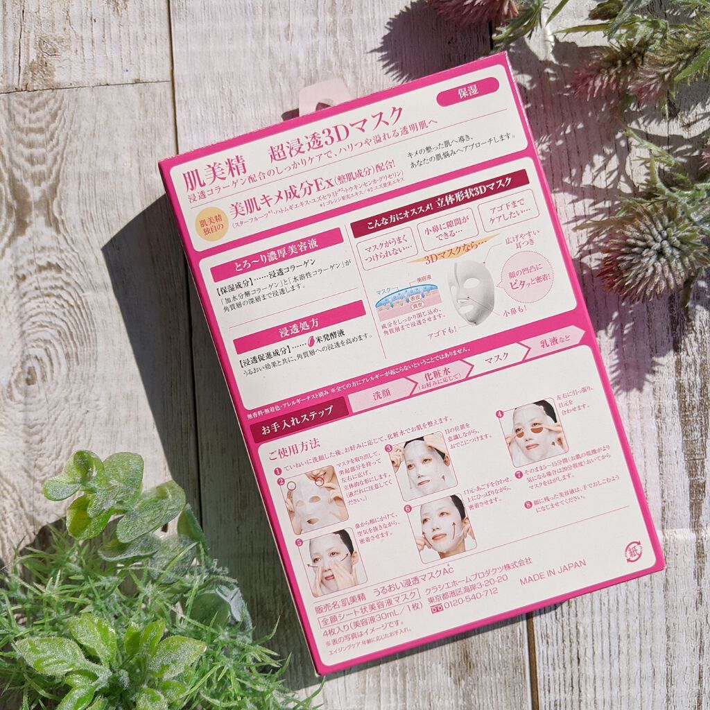- ●顔の凹凸にピタッ! と密着する、立体形状3Dマスクと、とろ~り濃厚美容液で高い保湿効果のシートマスクシリーズ ●ハリつや溢れる透明肌*1へ導く、しっかり保湿ケア ●肌美精独自の「美肌キメ成分Ex(スターフルーツ*2・ハトムギエキス・ユズセラミド*3・トウキンセンカ・グリセリン)」(整肌成分)を配合、キメの整った肌へ導き、肌悩みへアプローチ ●浸透促進成分「米発酵液」配合。うるおい効果とともに、角質層への浸透を高めます。 ●保湿成分「浸透コラーゲン」配合 ●たっぷり美容液 30mL ●無香料、無着色 ●アレルギーテスト済み*4 *1:うるおい効果による *2:ゴレンシ果実エキス *3:ユズ果実エキス *4:すべての方にアレルギーが起こらないということではありません。 ※超浸透:マスクの面積が肌美精シリーズの中で最も広く、広い範囲に浸透すること ※エイジングケア:年齢に応じたお手入れ