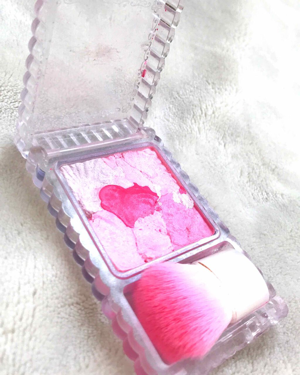 少し白っぽくてあまいピンク、大好きです このチークは青みがありつつも白っぽさもあってすごく可愛い 粉感は少なめでさらっとしてる パケから大優勝 色味の調節がしやすいグラデーションタイプ