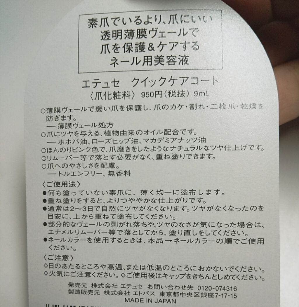 - 素爪でいるより、爪にいい。速乾!リムーバーいらず!透明薄膜ヴェールで爪を保護&ケアする、ツヤ出しネール用美容液。 弱い爪を摩擦や乾燥から保護し、爪のカケ・割れ・二枚爪・乾燥を防ぎます。 塗布すると、エッセンスコート成分が均一な薄膜をつくり、ナチュラル光沢成分&植物オイル(*)が自然なツヤを与えます。 ほんのりピンク色で、爪磨きしたようなナチュラルなツヤ仕上げです。 トルエンフリー、無香料で爪へのやさしさを配慮。 通常のトップコートやハードナーは、一部はがれると、厚みがあるため、凹凸になりますが、「クイックケアコート」は、厚みのない薄膜仕上げなので、落とさず、上から塗布してもキレイになじむので、リムーバーいらずです。 *ホホバ油・ローズヒップ油・マカデミアナッツ油 <こんな時におすすめ> ・爪を保護しながらツヤも出るので、マニキュアをお休みしたい時に ・超速乾だからササッと簡単にケアしたい時に ・ナチュラルなツヤ、仕事上ネールNGでもキレイに見せたい時に 【価格改定について】 いつもご愛用いただきありがとうございます。 この度、原材料高騰などにより、2025年9月1日より、希望小売価格の変更を行うこととなりました。 何卒ご理解を賜わりますよう、心よりお願い申し上げます。 エテュセ クイックケアコート 旧価格 税込1,045円(税抜950円) ↓ 新価格 税込1,265円(税抜1,150円)