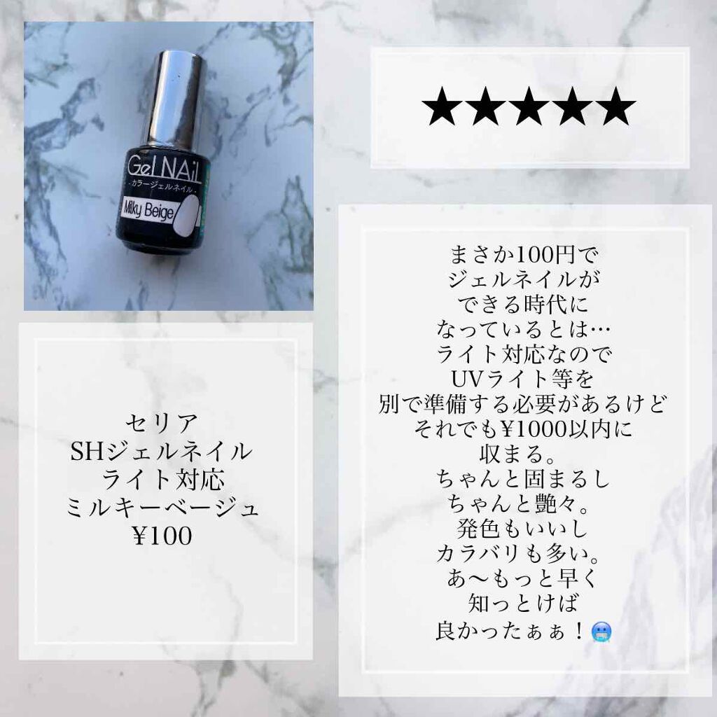 ★セリア★SHジェルネイル(ライト対応)これが100円で買える時代か…ありがたいな…といつもセリアのジェルネイルコーナーの前で嘆いてます(´-`)🤎カラバリも豊富すぎるし、セルフネイルする人の味方でしかない!下地だけしっかり整えておけば高いジ...