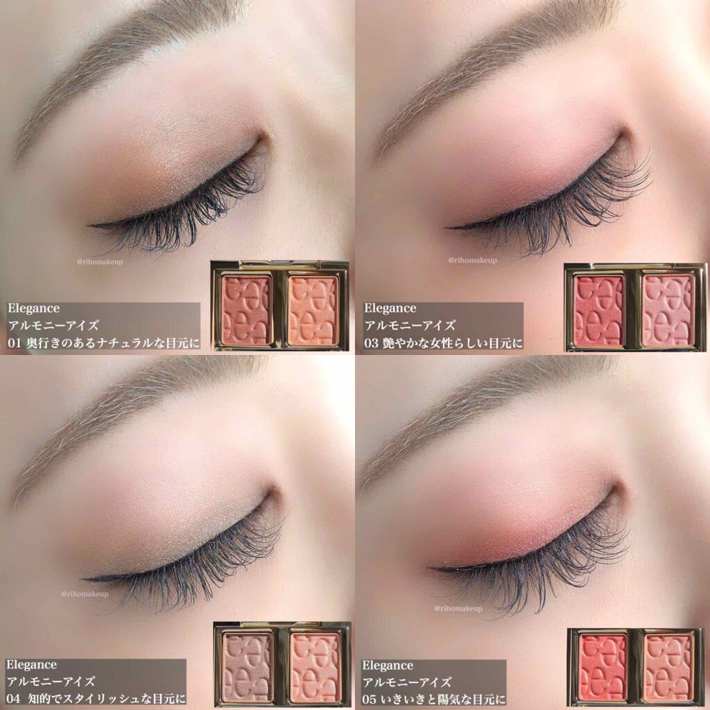 アルモニーアイズは2色で仕上げるのでテクニック要らずで、誰でも綺麗なグラデーションが出来るのが魅力🥺✨ ブラウンベースのカラーが豊富🙆♀️締め色がないので程よい抜け感が出ます🙌 キラキラしすぎない上品なパール感が本当に使いやすいですよ❤️ 3850円という価格も嬉しい✨ 左側のカラーを二重幅にのせてから、右側のカラーをアイホール全体にのせるだけ😊