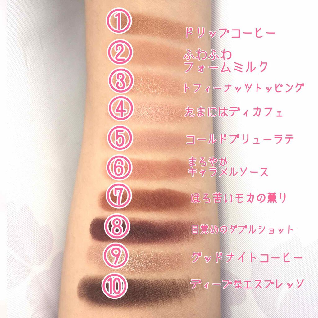 - 肌なじみの良い、鮮やかな発色で目元を華やかに彩る捨て色なしの10色アイシャドウパレット 異なる3種のテクスチャーを自由に組み合わせて、グラデーションも思いのままに。 NEW 2023.4 ・肌トーンにあう配色を詰め込んだトレンドカラー 肌トーンに合わせて、自分に似合うトレンドカラーが楽しめる♡ パーソナルカラー×トレンドカラーの掛け合わせパレットで、デイリーメイクもスペシャルメイクも気分にあわせてなりたい自分に! ・むにゅっとジェル質感ラメで高密着、煌めく目元 パレットの中でもポイントとなる大きめ粒子のラメは、ジェルのような新質感で落ちにくく肌にぴったりと密着します。キラキラとした目元をキープします。 ・使うカラーは大きめに!リアル捨て色なしパレット ベースやラメのよく使うカラーと締め色や濃い色等の減りが少ないカラーを異なるサイズで詰め込んだ、リアル捨て色なしパレット! <使用方法> 付属のデュアルシャドウブラシでベースカラーをまぶた全体に塗り広げます。細いブラシでグラデーションや目尻、アイライン、涙袋などのポイントカラーをのせて仕上げます。