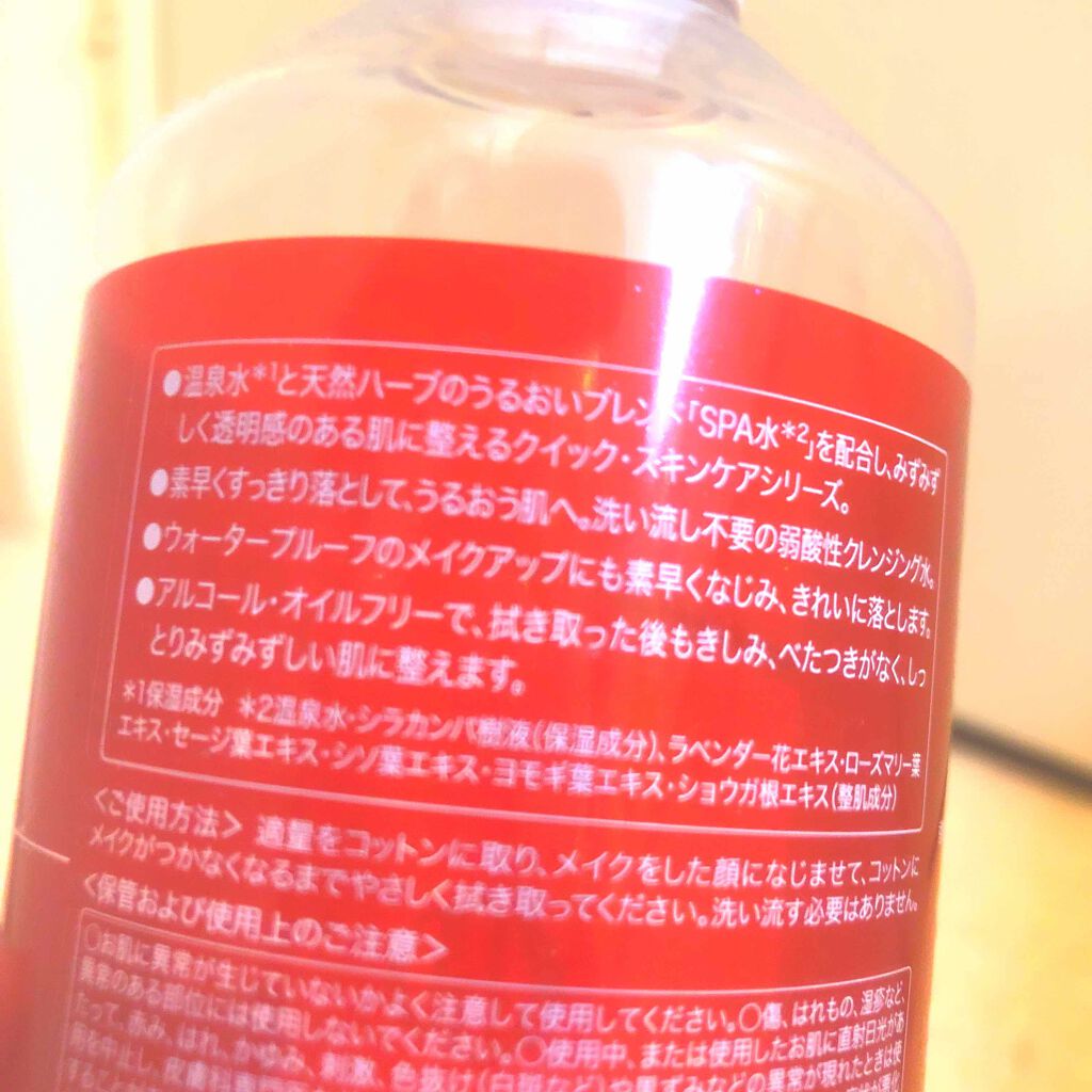 これ1本でメイク落とし・洗顔・うるおいケアまで! 拭き取るだけでメイクをしっかり落としながら、温泉水と6種のハーブエキスなどを配合した「SPA水」が肌のうるおいを保ち、しっとりみずみずしい素肌へ! うるおい成分*を95%以上配合!【保湿成分】☑️ミネラルを豊富に含み、美肌の湯として知られる出雲湯村の温泉水☑️シラカンバ樹液 さらっとしたウォータータイプで、クセがなくて使いやすい!クレンジング力も十分で、ウォータープルーフマスカラ以外はするんと落ちました!