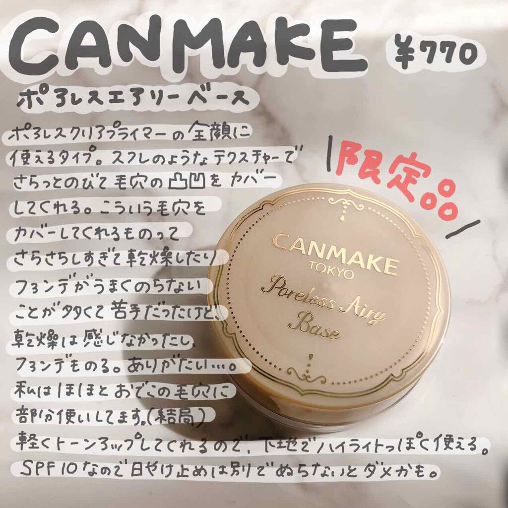 CANMAKE様の神下地(∩´∀`)∩ポアレスエアリーベース毛穴がなくなる!!しかも肌がトーンアップする!サラサラになる(´;ω;.:...今までのプライマー系で一番好き..しかも700円+taxとかまじかヾ(^ω^)ノただ、ベタベタしないの...