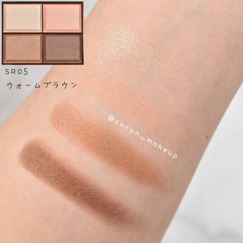 - 【ポイント】 1.失敗しらずのブラウンベースの4色パレット!簡単にグラデーションを実現。 2.しっとりリッチな質感!するする伸びて粉飛びもなく目元の乾燥も防ぎます。 3.上品な輝きの繊維パール+金パールを贅沢に配合。ギラつかない大人のツヤを演出。 <SR01'23・SR03'23・SR06'23・SR11'23(限定デザイン)> 実力派グラデアイシャドウからデジタルアートをあしらった限定デザイン登場。 しっとりリッチな密着感。肌のなじみの良い実力派グラデアイシャドウ。