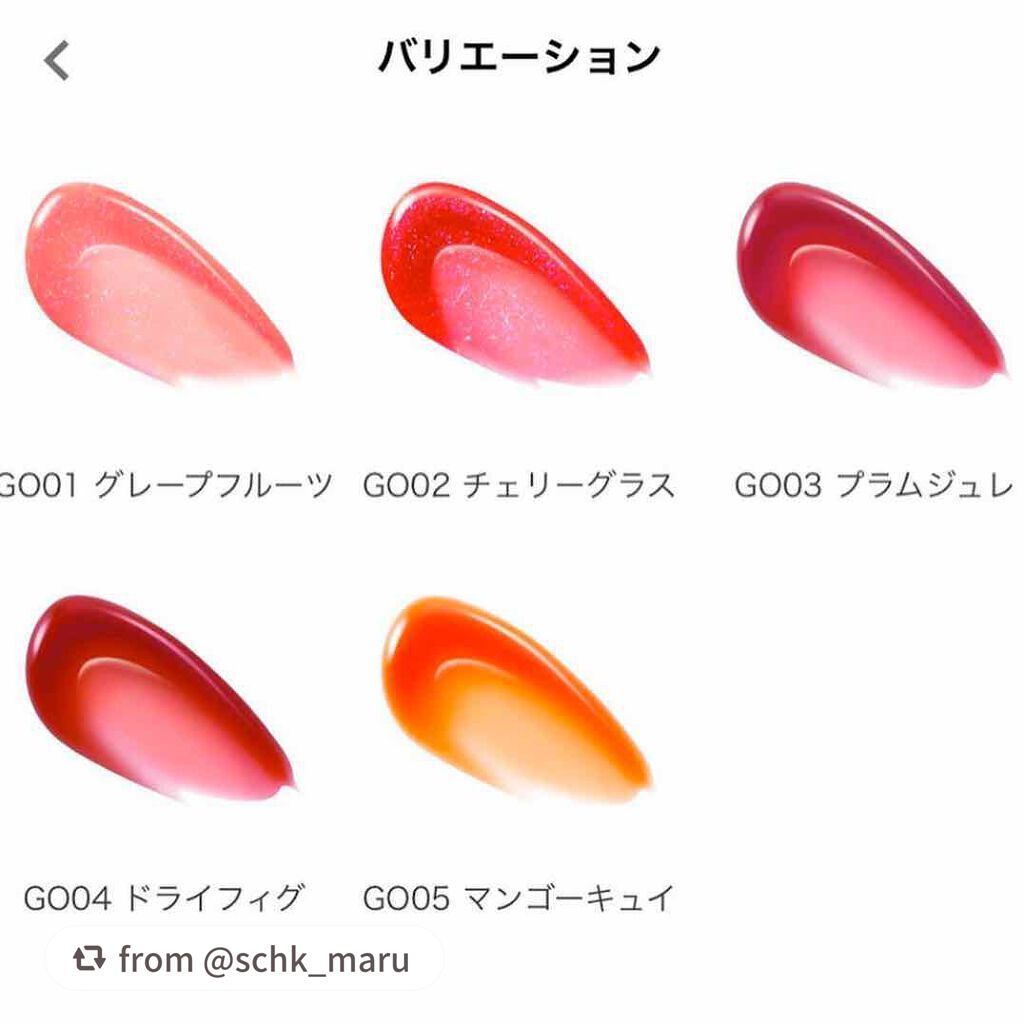 - <GO01 グレープフルーツ> 水添ポリデセン、水添ポリイソブテン、トリイソステアリン酸ポリグリセリル-2、水添(スチレン/イソプレン)コポリマー、ヒドロキシステアリン酸エチルヘキシル、ジメチルシリル化シリカ、アルガニアスピノサ核油、ブドウ種子油、マンゴー種子油、オリーブ果実油、シア脂、マカデミア種子油、メドウフォーム油、ジメチコン、トコフェロール、トリメチルシロキシケイ酸、硫酸Ca、フェノキシエタノール、(+/-) ホウケイ酸(Ca/Al)、シリカ、マイカ、ラウロイルリシン、黄4、黄5、合成フルオロフロゴパイト、酸化スズ、酸化チタン、酸化鉄、水酸化Al、青1、赤202、赤226 <GO02 チェリーグラス> 水添ポリデセン、水添ポリイソブテン、トリイソステアリン酸ポリグリセリル-2、水添(スチレン/イソプレン)コポリマー、ヒドロキシステアリン酸エチルヘキシル、ジメチルシリル化シリカ、アルガニアスピノサ核油、ブドウ種子油、マンゴー種子油、オリーブ果実油、シア脂、マカデミア種子油、メドウフォーム油、ジメチコン、トコフェロール、トリメチルシロキシケイ酸、硫酸Ca、フェノキシエタノール、(+/-) ホウケイ酸(Ca/Al)、シリカ、マイカ、ラウロイルリシン、黄4、黄5、合成フルオロフロゴパイト、酸化スズ、酸化チタン、酸化鉄、水酸化Al、青1、赤202、赤226 <GO03 プラムジュレ> 水添ポリデセン、水添ポリイソブテン、トリイソステアリン酸ポリグリセリル-2、水添(スチレン/イソプレン)コポリマー、ヒドロキシステアリン酸エチルヘキシル、ジメチルシリル化シリカ、アルガニアスピノサ核油、ブドウ種子油、マンゴー種子油、オリーブ果実油、シア脂、マカデミア種子油、メドウフォーム油、ジメチコン、トコフェロール、トリメチルシロキシケイ酸、硫酸Ca、フェノキシエタノール、(+/-) ホウケイ酸(Ca/Al)、シリカ、マイカ、ラウロイルリシン、黄4、黄5、合成フルオロフロゴパイト、酸化スズ、酸化チタン、酸化鉄、水酸化Al、青1、赤202、赤226 <GO04 ドライフィグ> 水添ポリデセン、水添ポリイソブテン、トリイソステアリン酸ポリグリセリル-2、水添(スチレン/イソプレン)コポリマー、ヒドロキシステアリン酸エチルヘキシル、ジメチルシリル化シリカ、アルガニアスピノサ核油、ブドウ種子油、マンゴー種子油、オリーブ果実油、シア脂、マカデミア種子油、メドウフォーム油、ジメチコン、トコフェロール、トリメチルシロキシケイ酸、硫酸Ca、フェノキシエタノール、(+/-) ホウケイ酸(Ca/Al)、シリカ、マイカ、ラウロイルリシン、黄4、黄5、合成フルオロフロゴパイト、酸化スズ、酸化チタン、酸化鉄、水酸化Al、青1、赤202、赤226 <GO05 マンゴーキュイ> 水添ポリデセン、水添ポリイソブテン、トリイソステアリン酸ポリグリセリル-2、水添(スチレン/イソプレン)コポリマー、ヒドロキシステアリン酸エチルヘキシル、ジメチルシリル化シリカ、アルガニアスピノサ核油、ブドウ種子油、マンゴー種子油、オリーブ果実油、シア脂、マカデミア種子油、メドウフォーム油、ジメチコン、トコフェロール、トリメチルシロキシケイ酸、硫酸Ca、フェノキシエタノール、(+/-) ホウケイ酸(Ca/Al)、シリカ、マイカ、ラウロイルリシン、黄4、黄5、合成フルオロフロゴパイト、酸化スズ、酸化チタン、酸化鉄、水酸化Al、青1、赤202、赤226