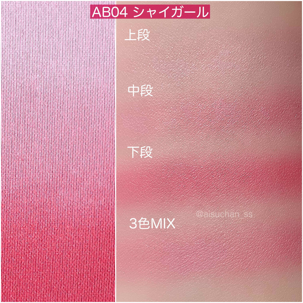 - <AB01-AB05共通> タルク、 ミリスチン酸亜鉛、 ジメチコン、 ジフェニルシロキシフェニルトリメチコン、 ワセリン、 セラミドNP、 スクワラン、 ホホバ種子油、 ブドウ種子油、 シリカ、 セスキイソステアリン酸ソルビタン、 トコフェロール、 水酸化Al、 フェノキシエタノール、 (+/-) グンジョウ、 マイカ、 黄4、 酸化チタン、 酸化鉄、 赤202、 赤226 <AB06-AB07> タルク、ミリスチン酸亜鉛、ジメチコン、ジフェニルシロキシフェニルトリメチコン、ワセリン、セラミドNP、スクワラン、ホホバ種子油、ブドウ種子油、シリカ、セスキイソステアリン酸ソルビタン、トコフェロール、水酸化Al、フェノキシエタノール、(+/-)グンジョウ、マイカ、酸化チタン、酸化鉄、赤226 <AB08-AB09> タルク、ミリスチン酸亜鉛、ジメチコン、ジフェニルシロキシフェニルトリメチコン、ワセリン、セラミドNP、スクワラン、ホホバ種子油、ブドウ種子油、シリカ、セスキイソステアリン酸ソルビタン、トコフェロール、水酸化Al、フェノキシエタノール、グンジョウ、マイカ、酸化チタン、酸化鉄、赤226、硫酸Ba