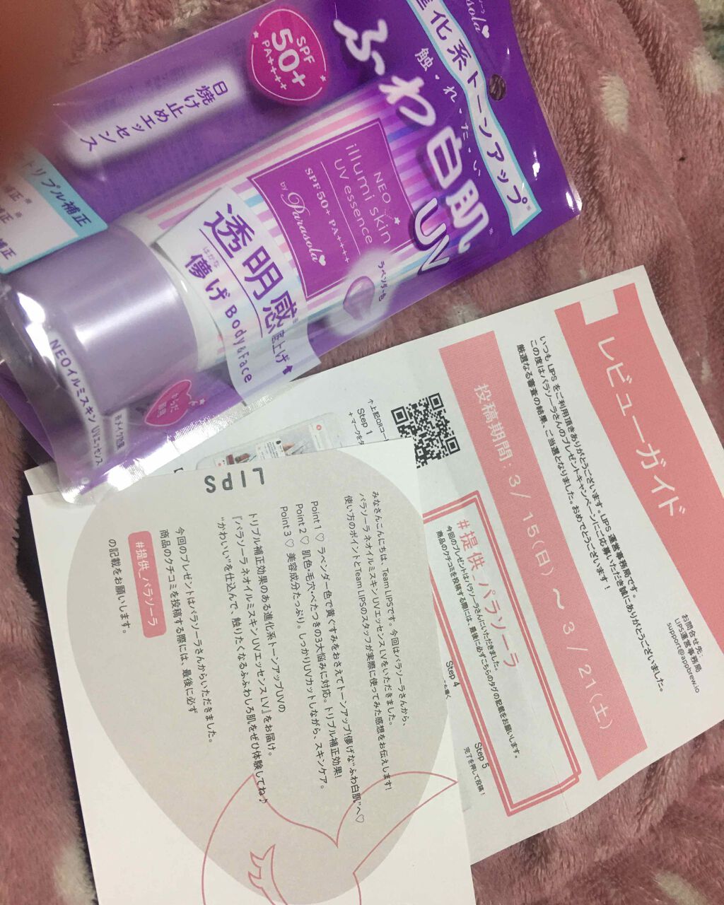 - トーンアップするだけの日焼け止めに満足できない人に。 トリプル補正効果搭載! 進化系トーンアップUV(*1) 【パラソーラ ネオイルミスキン UVエッセンス PK】誕生! ▽基本情報▽ SPF50+/PA++++。 トリプル補正効果搭載で理想の白肌へ。 ①色補正(*1):ラベンダーカラーで透明感&トーンアップ。黄ぐすみを抑えながらトーンアップし、透明感を底上げすることで儚げな白肌へ。 ②毛穴補正(*1):ソフトフォーカス効果パウダー((ビニルジメチコンメチコンシルセスキオキサン)クロスポリマー)配合で肌キレイ魅せ。気になる毛穴・凹凸をカバーし、均一美肌へ。 ③べたつき補正:汗吸着パウダー(シリカ)・べたつき抑制成分(ラフィノース)配合で、さらさら、すべすべ。触れたくなるふんわりやわらかな肌へ。 ●深紫外線対応成分、10種の美容成分(*2)(保湿成分)配合。 ●汗、水に強いウォータープルーフタイプ。ボディソープで落とせます。 ●化粧下地としても。 ●無香料・無鉱物オイル・弱酸性。 *1 メイク効果 *2 保湿型ビタミンC誘導体(リン酸アスコルビルMg)、浸透型ビタミンC誘導体(テトラヘキシルデカン酸アスコルビル)、高浸透型ビタミンC誘導体(パルミチン酸アスコルビルリン酸3Na)、アルブチン、プラセンタエキス、ハトムギエキス(ハトムギ種子エキス)、セラミド(セラミド3)、ヒアルロン酸(ヒアルロン酸Na)、コラーゲン(水溶性コラーゲン)、リピジュア○R(ポリクオタニウム-51)