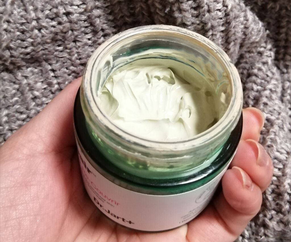 - 赤みをきちんとカバーするスキンケア兼用下地。緑色のクリームが肌でベージュ色に変化し、ニキビ跡やくすみをカバーします。