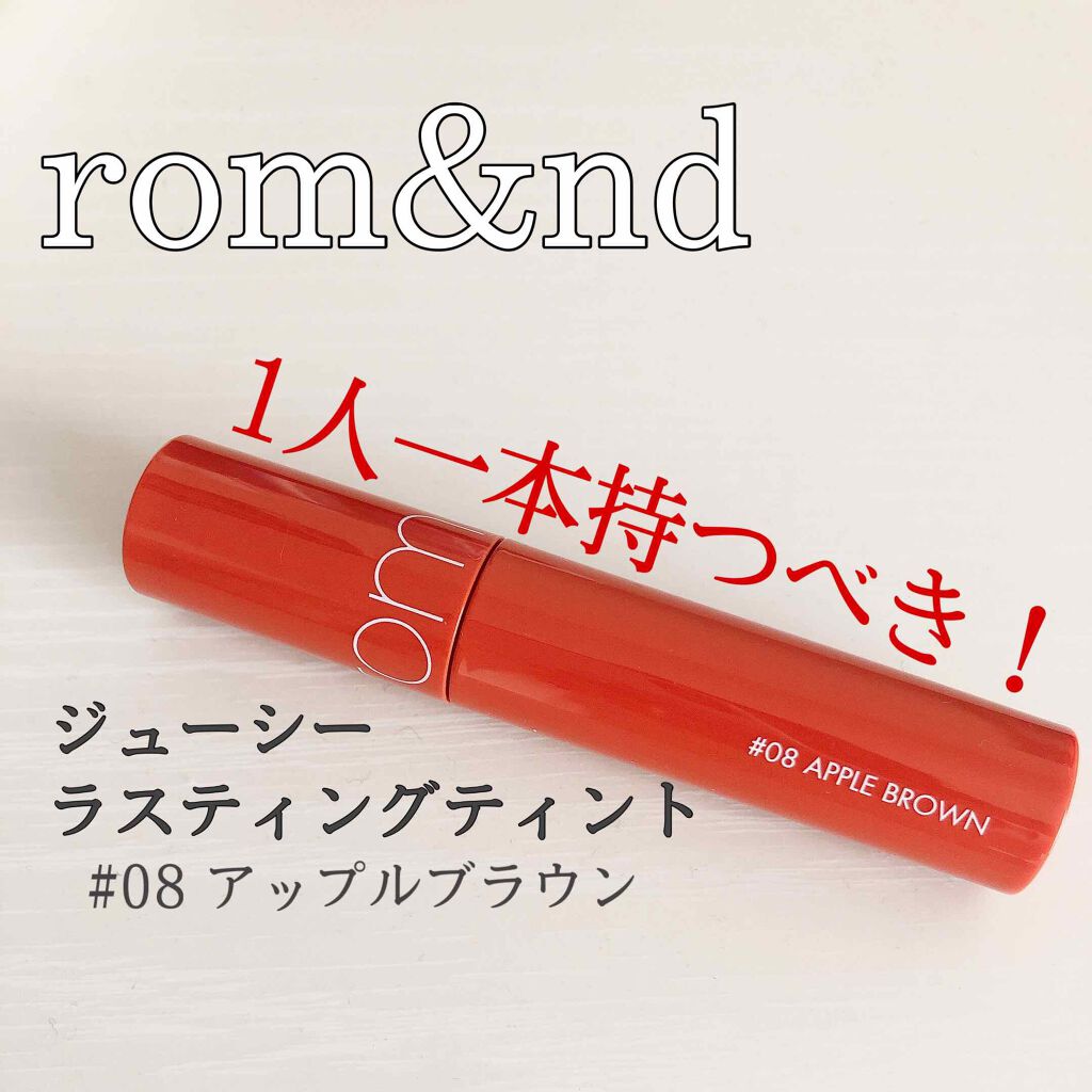 ロムアンドジューシーラスティングティント08アップルブラウン¥1320😉いいところ✔︎色味✔︎色もち✔︎ツヤ感✔︎一本で万能🤭気になるところ✔︎大きさ✔︎香りとても話題なので気になって買ってみました!まず、色がかわいい💕ティントっぽくない絶妙...