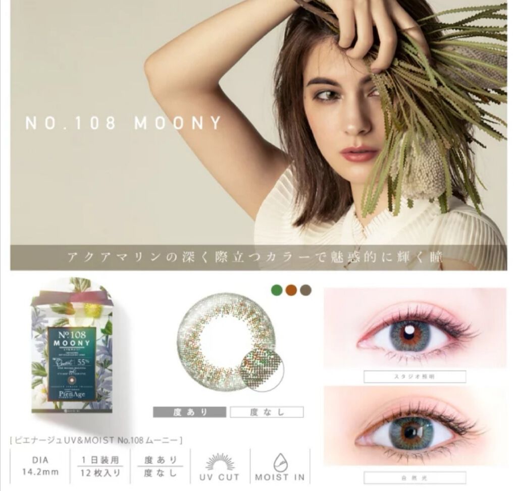 - なりたい瞳を叶える魔法。瞳に優しく、美しいヒミツ。 つけるだけで女性がなりたい自分に近づくコスメコンタクト「PienAge」 使用期間:1日使い捨て(ソフトコンタクトレンズ) 度数:±0.00D、-0.50D~-6.00D(0.25Dステップ)、-6.50D~-8.00D(0.50Dステップ) レンズ直径(DIA):14.0mm/14.2mm レンズ着色直径 :13.2mm/13.6mm ベースカーブ(BC):8.6mm 含水率:38%