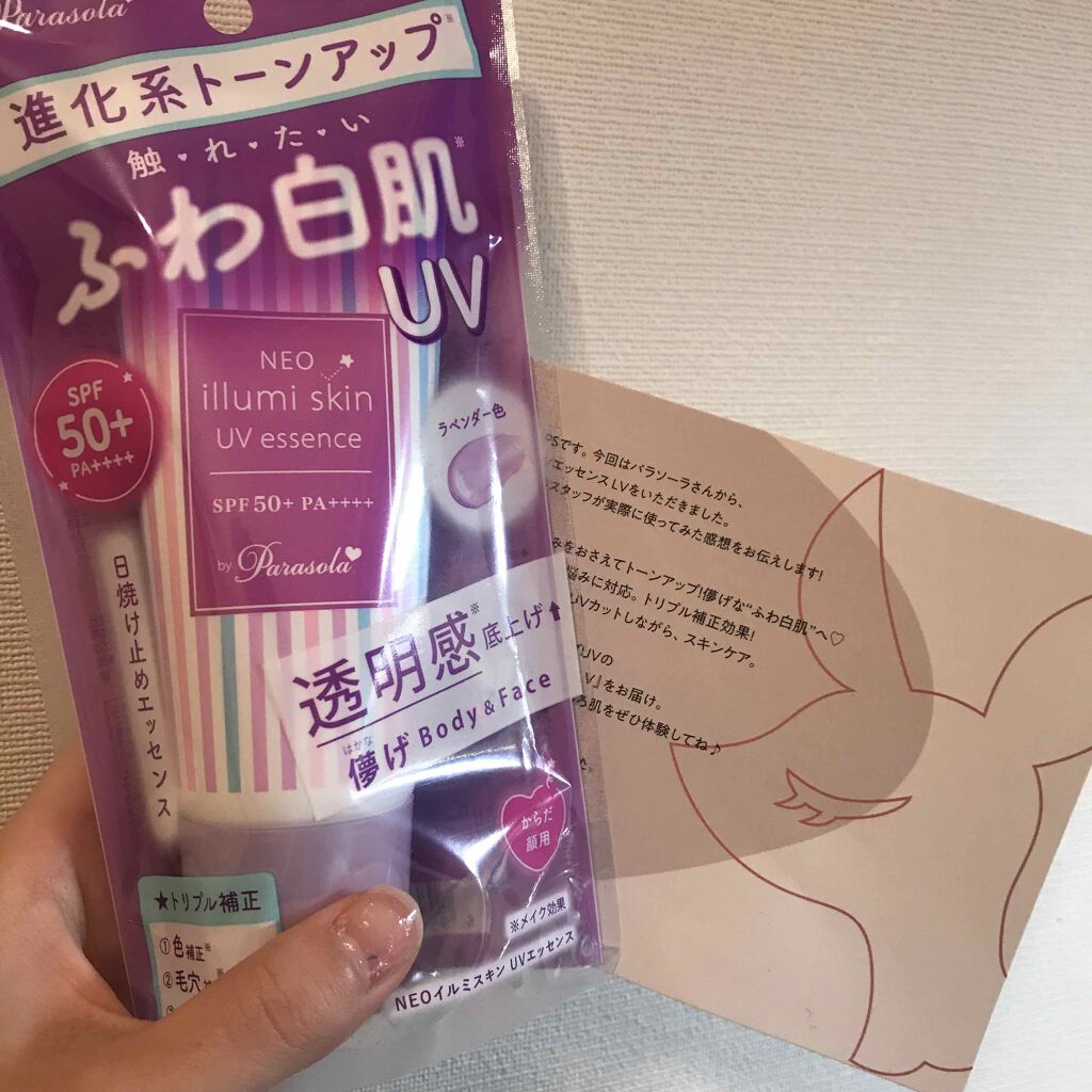 パラソーラネオイルミスキンUVエッセンスLVSPF50+PA++++・ラベンダー色でトーンアップ・すぐに乾いてベタつかない・ウォータープルーフ・化粧下地にも使える・10種類の透明感アップ成分(保湿成分)配合・ボディーソープで落とせる→肌色・毛...