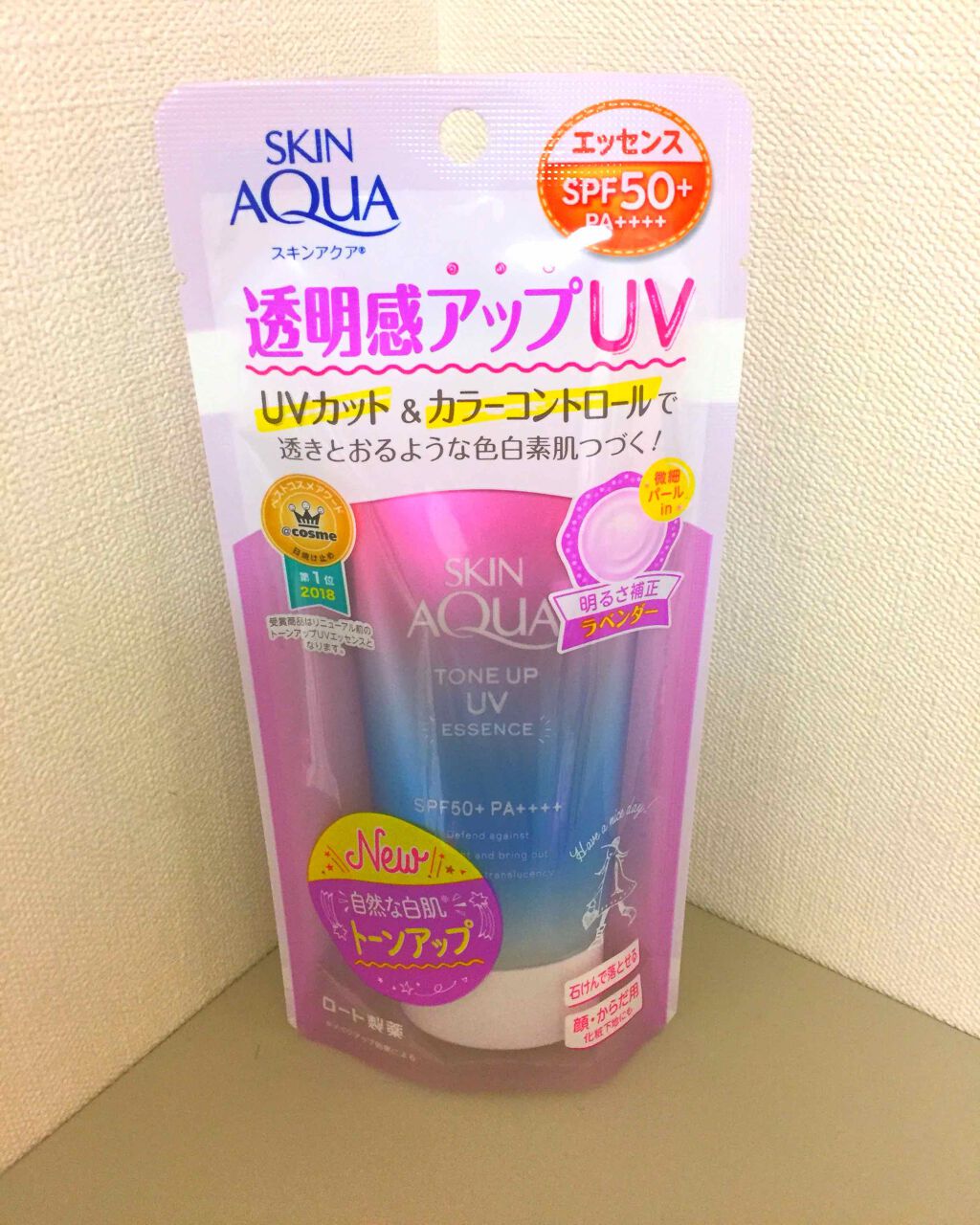- ※カラー名称「ハピネスオーラ」は「ローズ」へ名称変更となりました。 <ミントグリーン> 赤み補正*1!UVカットしながら、色と光をコントロールし、肌をトーンアップ*1。 ミントグリーンカラーで透き通るような素肌つづく!エッセンスタイプの日焼け止め。 透明感*1のある肌に。 SPF50+、PA++++、UV耐水性★★。 鉱物油フリー。パラベンフリー。ときめくサボンの香り。 <ラベンダー> 明るさ補正*1!UVカットしながら、色と光をコントロールし、肌をトーンアップ*1。 透明感*1を引き出すラベンダーカラーの日焼け止め。 すーっとのびて、みずみずしい使い心地のエッセンスタイプ。 SPF50+、PA++++、UV耐水性★★。 鉱物油フリー。パラベンフリー。ときめくサボンの香り。 <ローズ> 血色感補正*1!UVカットしながら、色と光をコントロールし、肌をトーンアップ*1。 ローズカラーで血色をプラスし、透明感*1のある肌に。 エッセンスタイプの日焼け止め。 SPF50+、PA++++、UV耐水性★★。 パラベンフリー。ハピネスブロッサムの香り。 <ブルー> UVカットしながら、色と光をコントロールし、肌をトーンアップ*1。 血色感を抑えて儚げな色白肌*1に見せるブルーカラーの顔・からだ用日やけ止め。すーっとのびて、みずみずしい使い心地。 透明感ブルー×透明感ホワイト=はかなげブルーカラーで、自分史上最高*2の色白肌*1、うるおう美容液成分(うるおい成分)としてヒアルロン酸Na、ビタミンC誘導体*3配合。 SPF50+/PA++++。こころがときめくサボンの香り。化粧下地にも。石けんで落とせます。 パラベンフリー。鉱物油フリー。アレルギーテスト済み(全ての方にアレルギーが起こらないというわけではありません)。 *1:メイクアップ効果による *2:スキンアクアシリーズにおいて *3:リン酸アスコルビルMg(うるおい成分)