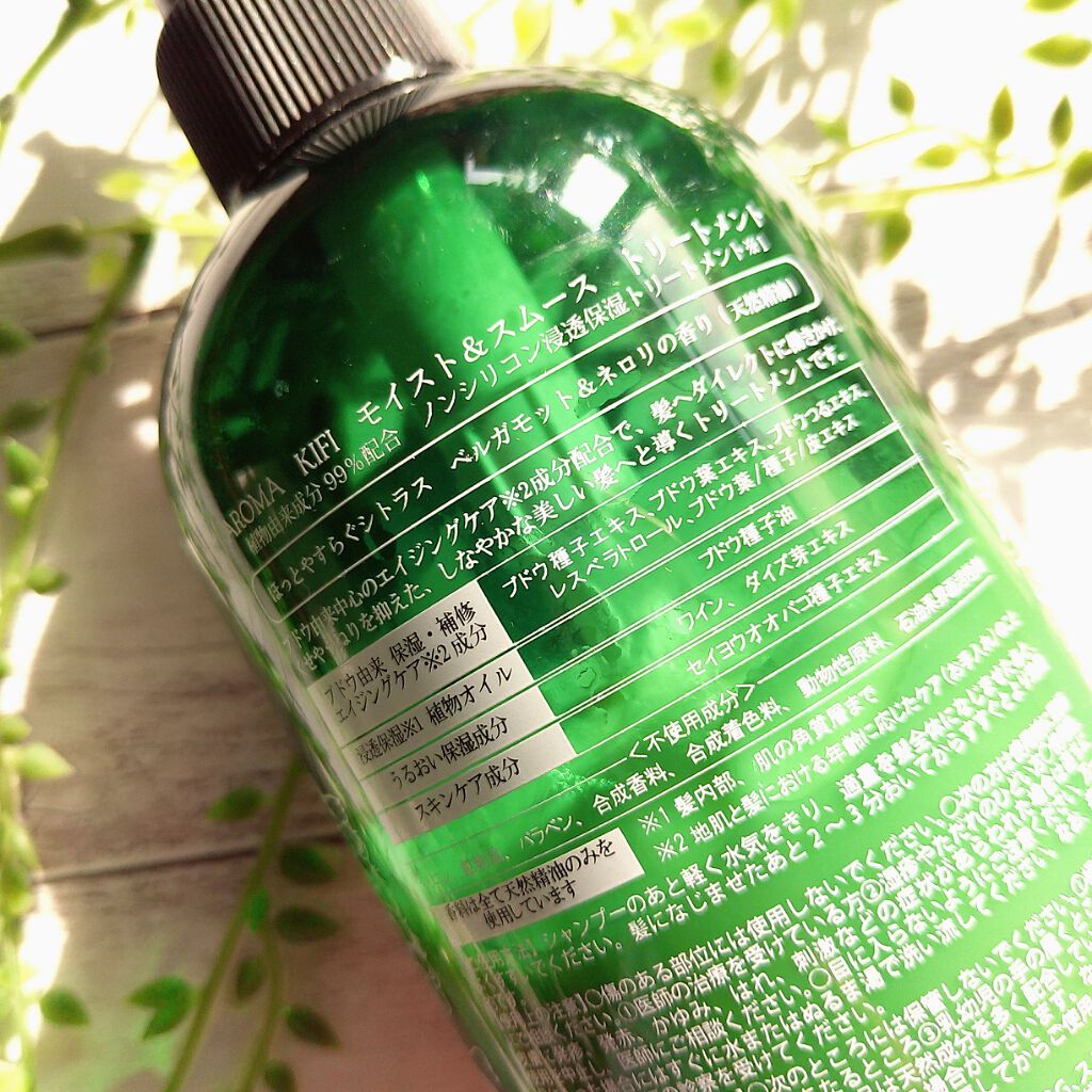 - 『AROMAKIFI(アロマキフィ)』ヘアケアシリーズはアロマセラピーメーカーが贈る、ナチュラルヘアケアシリーズです。全ラインアップ製品シリコンはもちろん、香りは「ガイア エッセンシャルオイル」だけを使い、合成香料にはない、自然の香り、アロマの香りをバスルームでお楽しみ頂けます。硫酸系/石油系界面活性剤、パラベン、鉱物油、合成香料、合成着色料、動物由来原料を使用していない、植物由来成分のみを配合。この度リニューアルした、『アロマキフィモイスト&スムース』シリーズは、従来の植物由来成分99%配合、天然の香り(オーガニック認定の天然精油配合)というコンセプトはそのままに、髪と頭皮の糖化に着目! 優れた力を持つぶどうの種から茎までのエキスをホールプラントとして配合しています。植物由来のアミノ酸系洗浄成分で髪と頭皮を優しく洗い、また、グレープシードオイルやポリアミンなど基礎化粧品にも多く使われるスキンケア成分が頭皮もしっかりケア。しなやかで自然なまとまりのある髪に導きます。香りはオーガニックベルガモットとネロリエッセンシャルオイルを使用。爽やかなシトラスでありながら、ほのかに甘い、アロマセラピーメーカーが厳選した、世界から集めた珠玉のエッセンシャルオイルの香りをお楽しみください。