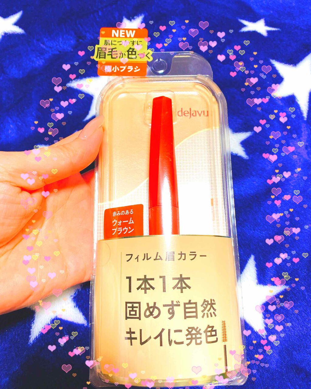 1本1本色づき固まらない「フィルム眉カラー」 塗りやすい極小ブラシで簡単垢抜け✨ デジャヴュ独自の薄膜フィルムを採用。 毛がパリッと固まらず、タバやダマのないふんわり自然な眉に。 フィルムタイプで速乾性が高く、皮脂・汗・こすれに強いのに、お湯だけで簡単に落とせます✨